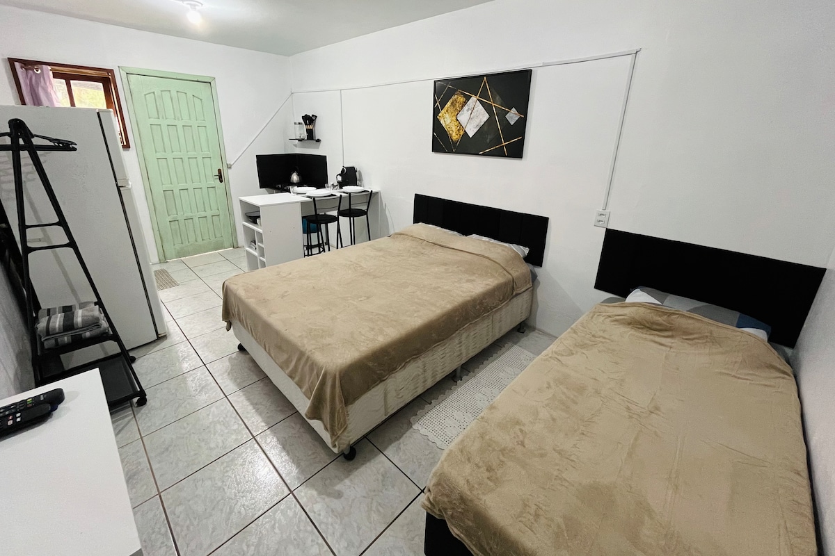 Studio confortable et cosy dans un quartier résidentiel, très bien situé. À proximité de l'UFSC et de l'UDESC, et à 9 km du centre-ville. Un endroit calme et tranquille, où vous pourrez passer une bonne nuit de sommeil. Il y a aussi un espace extérieur où vous pourrez vous détendre, prendre un café et un bain de soleil, ainsi que notre Golden Retriever aimant. Vous allez adorer ! Vous disposerez d'une cuisine complète, d'un lit double, d'une douche avec eau chaude, d'une armoire, d'un système de climatisation, d'une connexion Wi-Fi, d'une télévision par câble, d'un linge de lit, de couvertures, de serviettes et de chauffage.