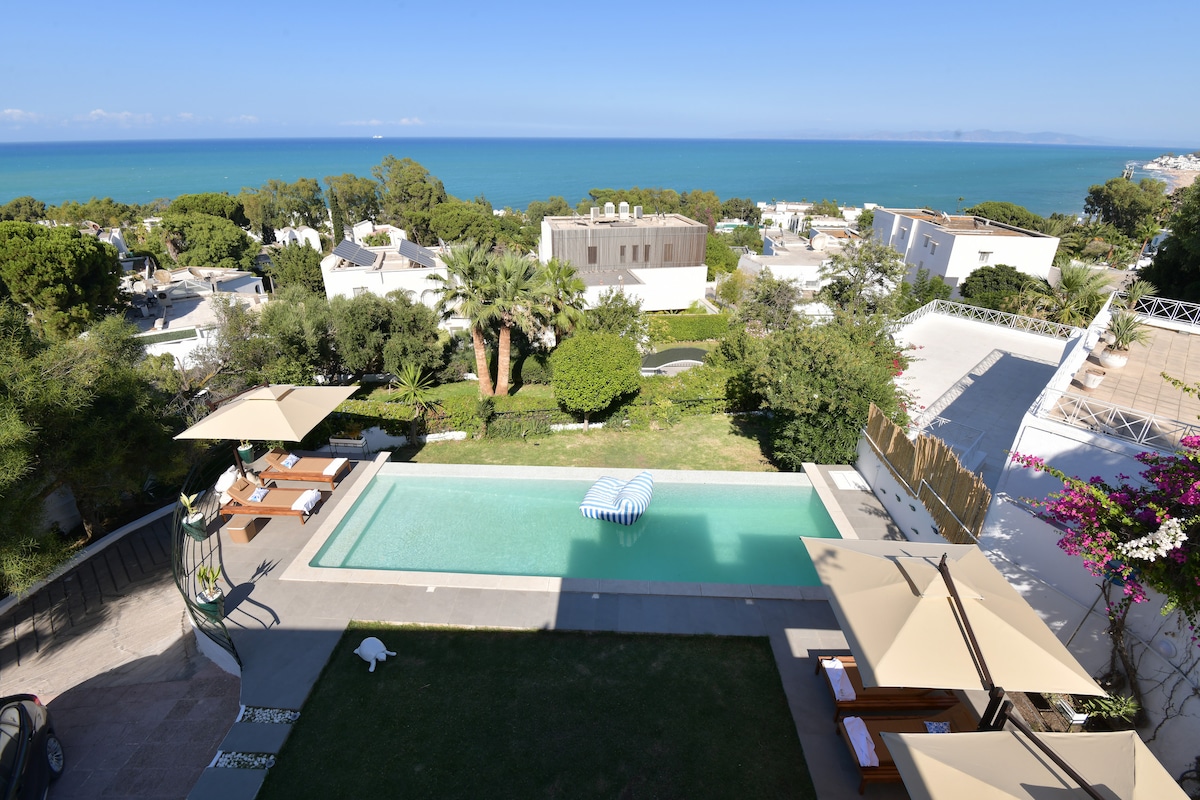 Détendez-vous et appréciez sans retenue la vue mythique de la baie d'Amilcar. Nichés dans ce petit chalet, vous ne vous lasserez pas de contempler les rouges chatoyants des flans de la colline de Sidi Bou Saïd. Ce perchoir est le lieu idéal pour s'évader, tout en restant proche du site archéologique de carthage et du village surnommé "le paradis blanc et bleu" : Sidi Bou Saïd.