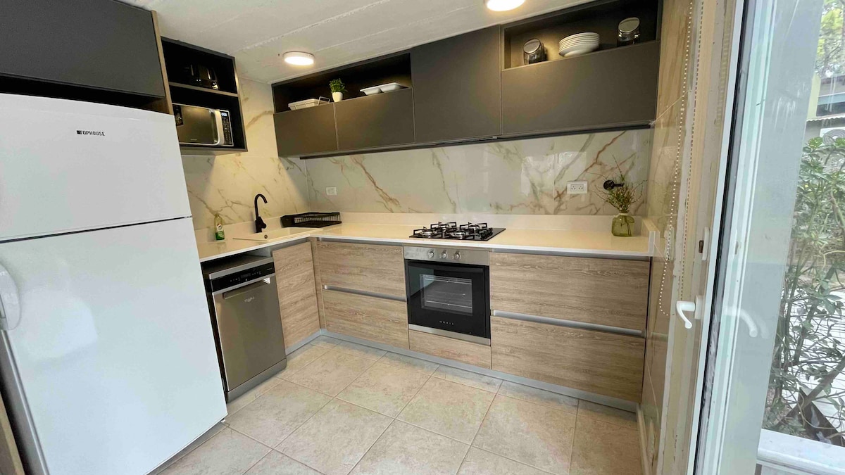 Incroyable micro-maison en béton au milieu de la forêt, respectant la nature du lieu, environnement unique avec un lit queen size, un bureau, 2 chaises et le Wi-Fi. Salle d'eau avec douche, lavabo, wc. Kitchenette avec évier, plaque électrique, micro-ondes et réfrigérateur avec congélateur, elle n'est PAS pour cuisiner. Très lumineuse avec la mer à 700 m et le centre commercial à 600 m. Cette belle maison est cachée derrière la maison principale avec une intimité et une autonomie totales. Barbecue extérieur à usage commun du lieu. Bienvenue !