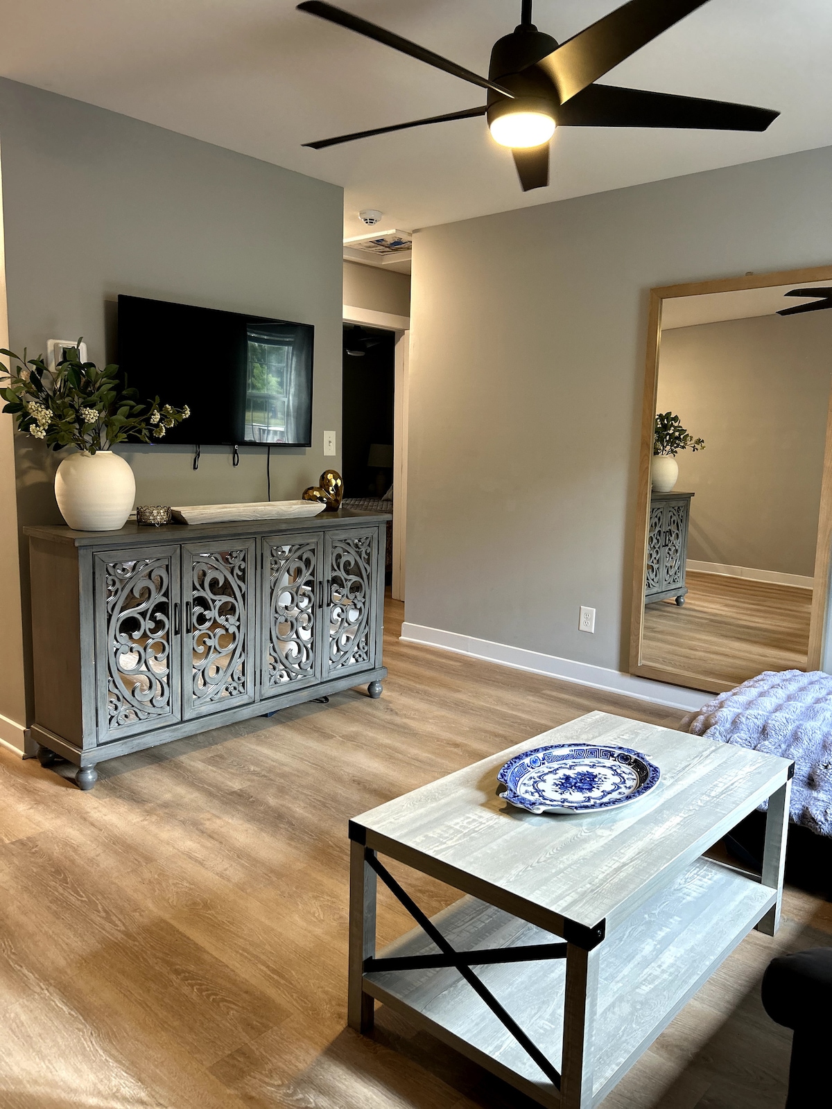 Beautifully renovated 2 bedroom apartment with a full kitchen stocked with ceramic cookware and all the utensils you'd find at home. Wrap up on the couch in a throw blanket and put on a movie with our 50" Roku TV that allows you to stream all of your favorites. When it's time for bed, make your way to one of two queen size beds with green tea cooling memory foam and crisp white linen. In the morning, wake up and pop your computer open on one of our desks, it's time to work - or not! ;)