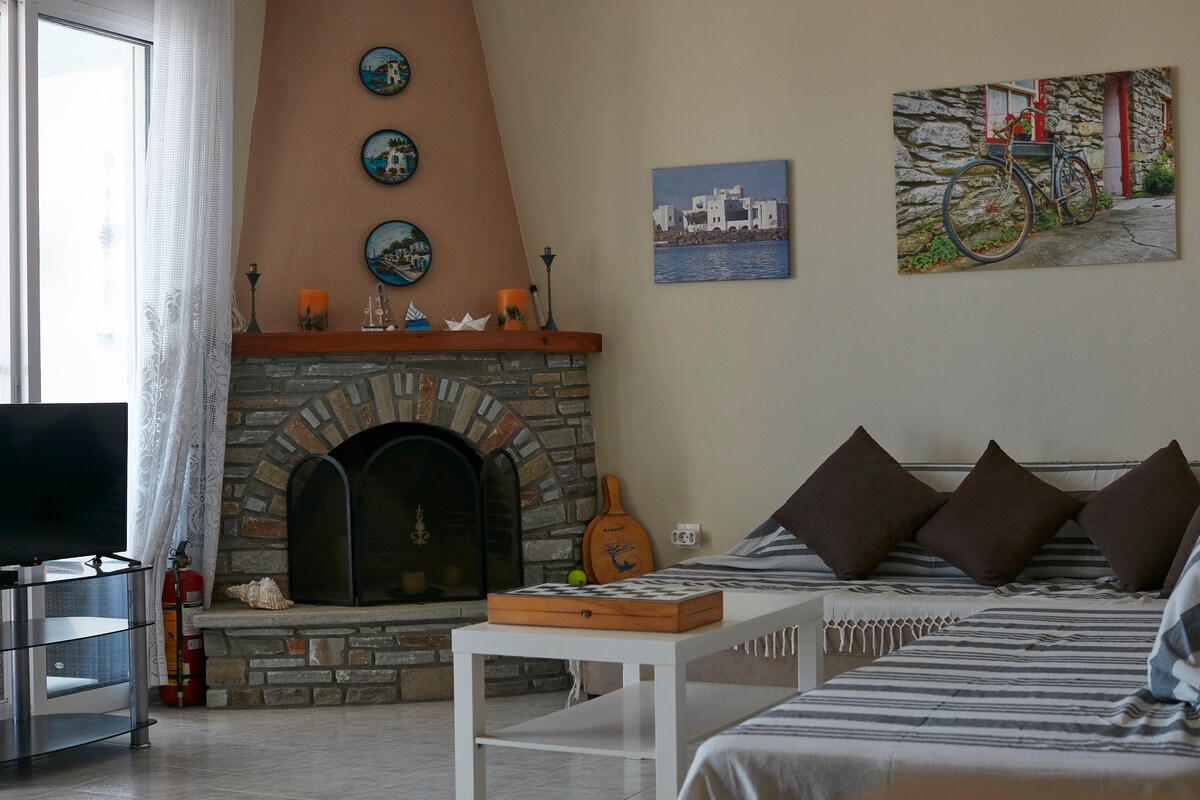 Appartement cosy avec une très belle vue situé à l'intérieur du village de Nea Poteidaia à côté de la mer. Il y a une petite plage que vous pouvez descendre par des escaliers. Il y a aussi une autre plage située de l'autre côté du village qu'il vous faudra environ 10 minutes à pied. Bien sûr, il y a la possibilité d'aller à la plage d'Agios Mamas qui est l'une des plus belles plages de Chalkidiki. Enfin, dans les environs, il y a d'excellents restaurants avec de la bonne nourriture que vous pouvez visiter.