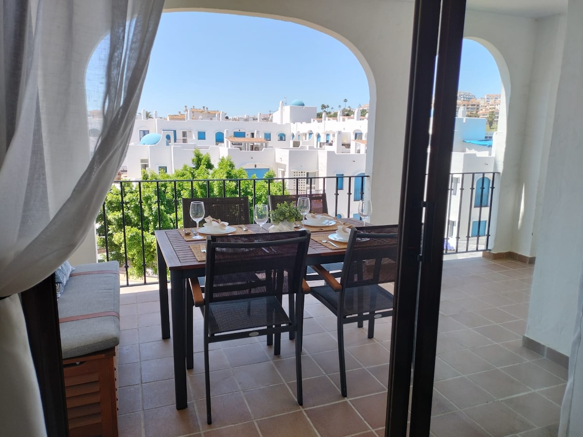 Appartement entièrement équipé avec vue sur la mer depuis la grande terrasse à visiter à tout moment de l'année, parfait pour l'automne, l'hiver et le printemps où vous profitez vraiment de la terrasse. 2 chambres, 2 salles de bains, pour 4 personnes. La chambre principale avec accès à la terrasse. Très spacieux, environ 90 mètres carrés. 1 salle de bain complète à l'intérieur de la chambre principale, salon très spacieux Le Wifi a une vitesse de 600 Mb, le plus rapide, et la télévision avec 200 chaînes européennes, britanniques, allemandes, françaises, etc. Parking.