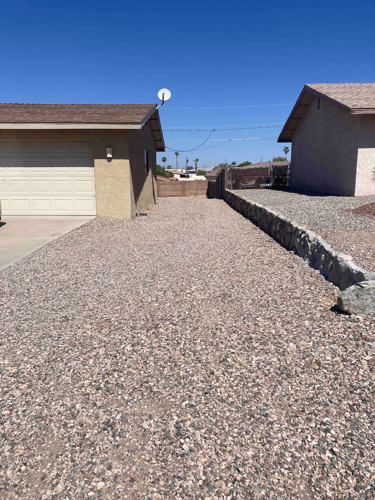 Apportez vos jouets et profitez de notre hébergement confortable. Notre maison de 2 chambres et 2 salles de bain récemment rénovée sur une propriété entièrement clôturée dispose de nombreuses places de stationnement pour tous vos véhicules, bateaux et/ou jouets, y compris un abri auto. Notre patio couvert est un endroit idéal pour profiter d'un repas en plein air ou tout simplement passer du temps à l'ombre. À 10 min de la marina Topock 66, à 15 min de Pirates Cove et de nombreux sentiers hors route juste devant la porte. Restaurants, station-service, magasin à un dollar et magasin général à proximité. Chiens acceptés, frais supplémentaires. Pas de chats, d'oiseaux, etc.