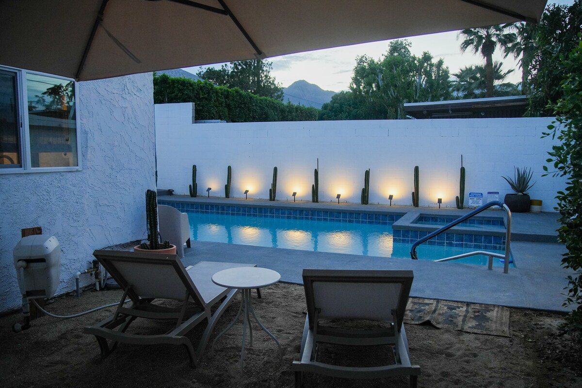 Identifiant de la ville n° 2856 Véritable maison de plain-pied de 1960 avec trois chambres, une piscine privée étincelante et un spa. Rénovée pour accueillir confortablement six personnes. À sept minutes en voiture du centre-ville animé de Palm Springs. À trois pâtés de maisons du magnifique parc Demuth, où vous trouverez des terrains de pickleball, des pistes cyclables et des sentiers pédestres, un centre communautaire et des terrains de jeux luxuriants. Emplacement central idéal pour accéder à Joshua Tree et à toutes les villes du désert, à quelques minutes du golf, des commerces, des restaurants et de l'aéroport. Tout est là, vous attend !