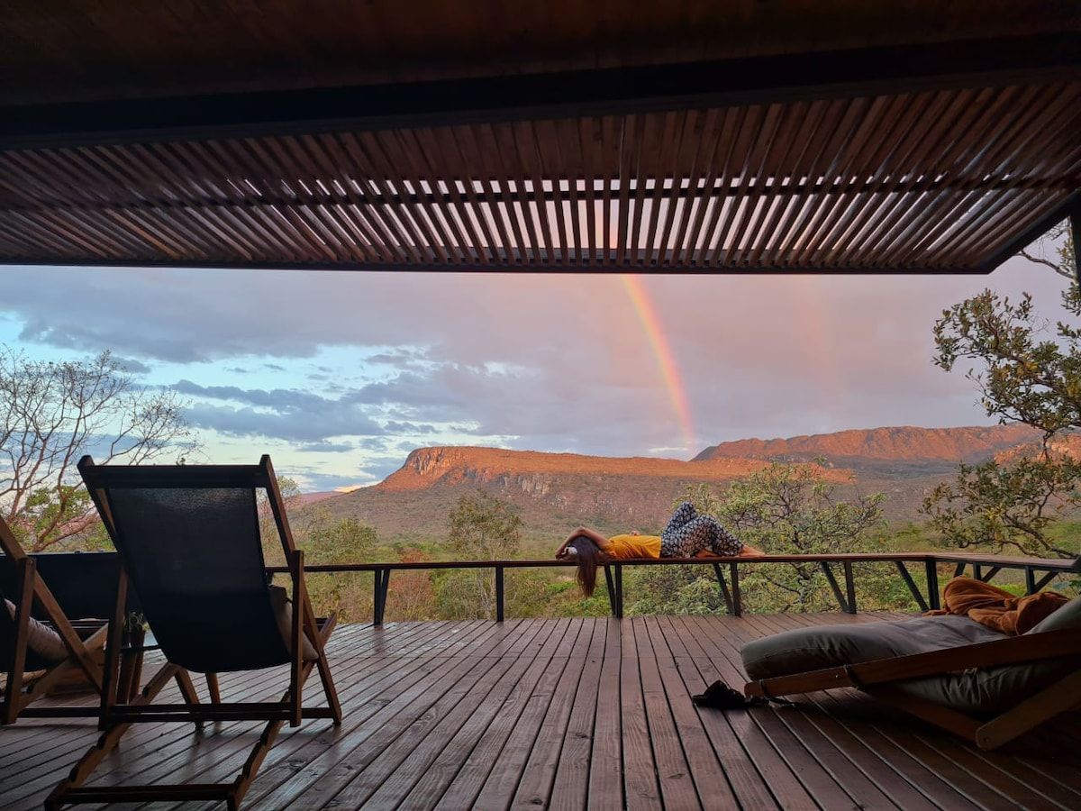 Chalet Observatoire : une expérience unique, maintenant avec option de petit déjeuner ! Sentez-vous plus proche des étoiles et laissez-vous littéralement envelopper et toucher par la nature de la Chapada dos Veadeiros! À l'extérieur, il pointe vers la Voie lactée. À l'intérieur, il y a un sentiment d'accueil et d'expansion. Le projet vous invite à lever les yeux, à élever vos pensées et votre cœur. Dans cet état, observez la nature en vous et autour de vous dans un espace soigneusement conçu pour ralentir, se reconnecter, s'amuser et se purifier.