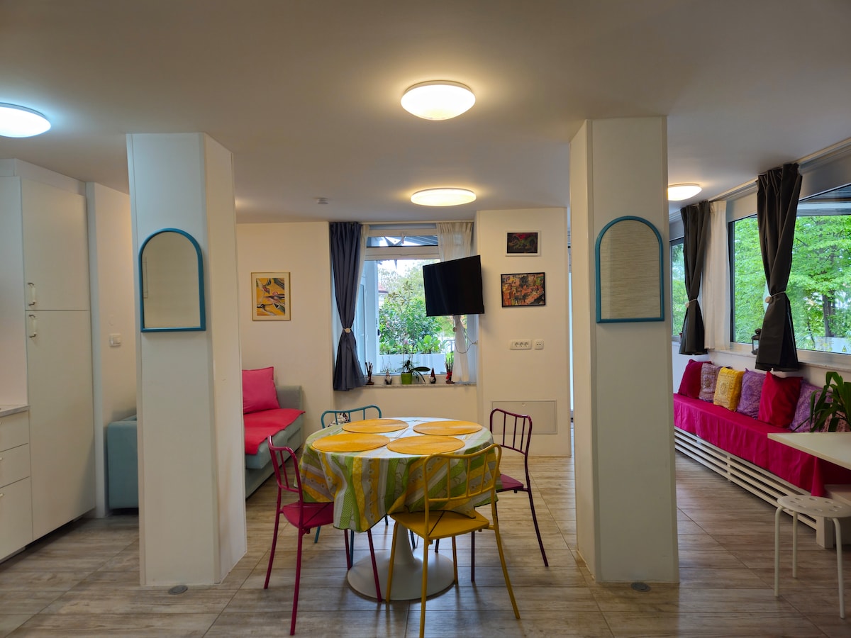 Bienvenue à L'ART de la villa à Ljubljana, votre maison idéale loin de chez vous. La villa ART est un refuge unique, situé dans un quartier calme de la ville, mais en même temps à quelques pas de tous les sites et événements du centre de Ljubljana. Cet appartement meublé de manière moderne est idéal pour 4 amis ou petites familles, car il peut accueillir jusqu'à 4 personnes. Ces peintures sont des œuvres privées du propriétaire et de ses connaissances culturelles, qui ajoutent une touche artistique.