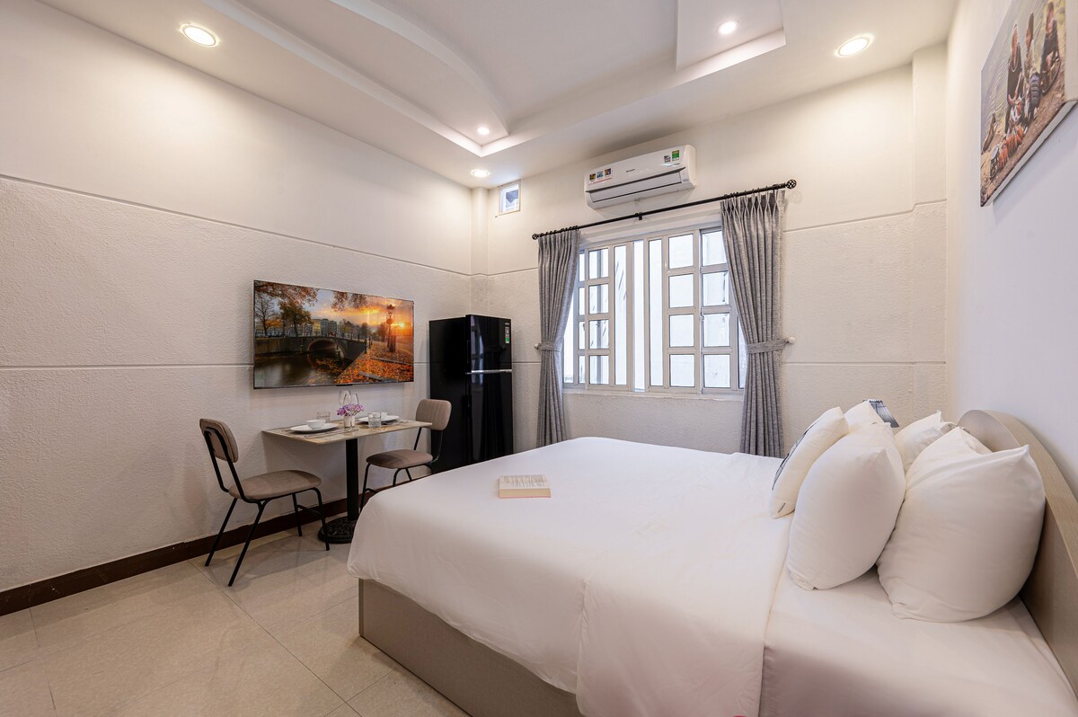 Cet endroit unique est conçu pour une expérience de luxe dans le style. Avec une porte coulissante intelligente, votre salon et votre chambre sont facilement connectés pour maximiser la maison spacieuse de 50 m2. En marchant sur le pont BaSon entre l'appartement et la D1, vous pouvez sentir la brise de la rivière Saigon et une vue spectaculaire sur la ville. En seulement 5 à 10 minutes en taxi, vous pouvez vous rendre au centre-ville.