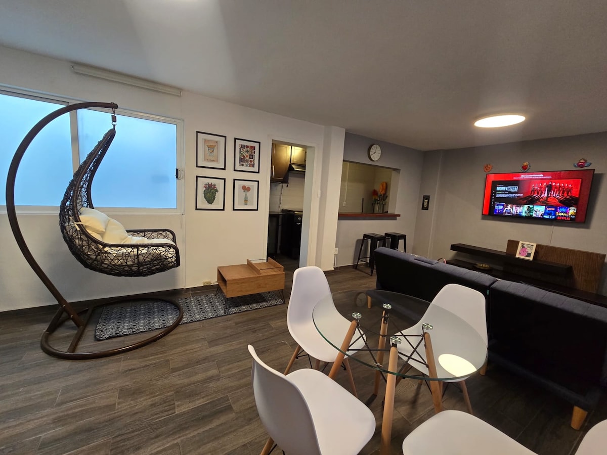 Cet espace situé sur l'une des principales avenues du pays, près de l'Av Reforma et du centre historique, est parfait pour les voyages de tourisme ou d'affaires. Vous serez fasciné par sa vue panoramique spectaculaire sur l'aile centrale et le palais des Beaux-Arts. De plus, il a tout ce dont vous avez besoin pour rendre votre séjour exceptionnel : lit king size, cuisine spacieuse et entièrement équipée, espace de travail, wifi haute vitesse et une décoration chaleureuse pour que vous vous sentiez comme à la maison(Checkin 4pm)