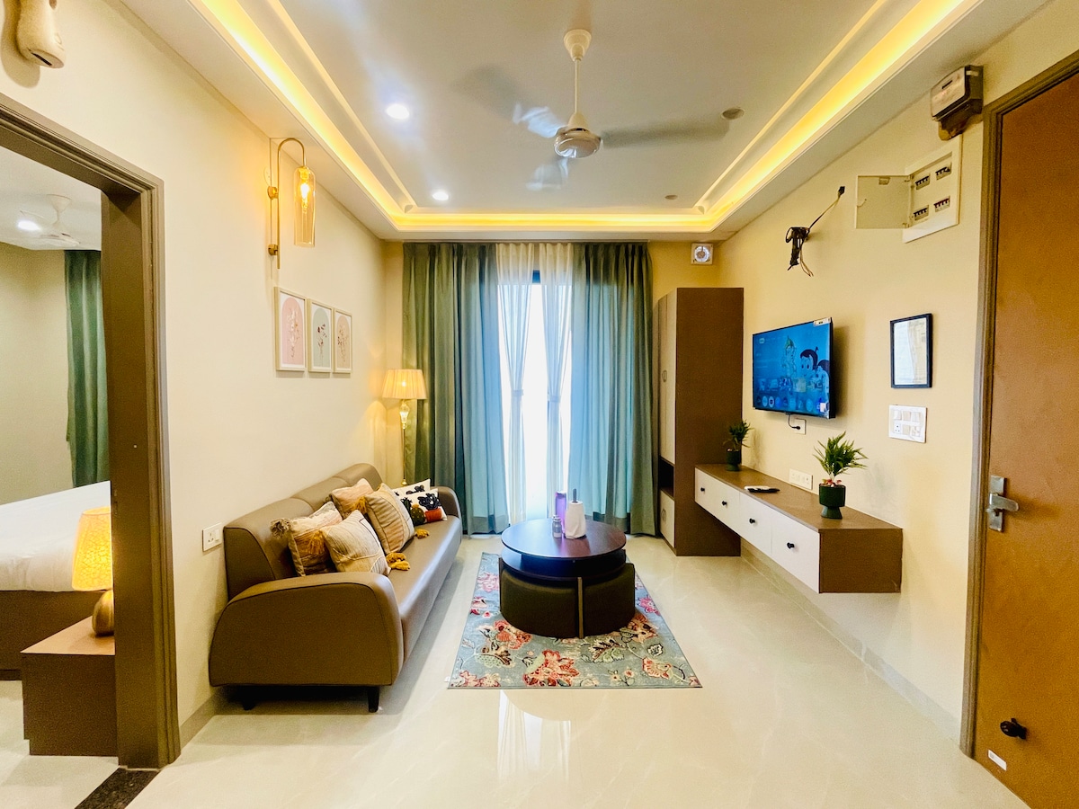 Enjoy a comfortable and stylish stay in this modern, spacious 1BHK luxury apartment, thoughtfully designed to accommodate up to 4 guests. A comfortable king-size bed, while the living area includes a king-size sofa cum bed, making it ideal for families, couples, or small groups. The apartment offers two premium bathrooms, ensuring convenience and privacy. A fully equipped kitchen allows you to cook with ease and step outside to the peaceful outdoor sitting area, perfect for morning tea .