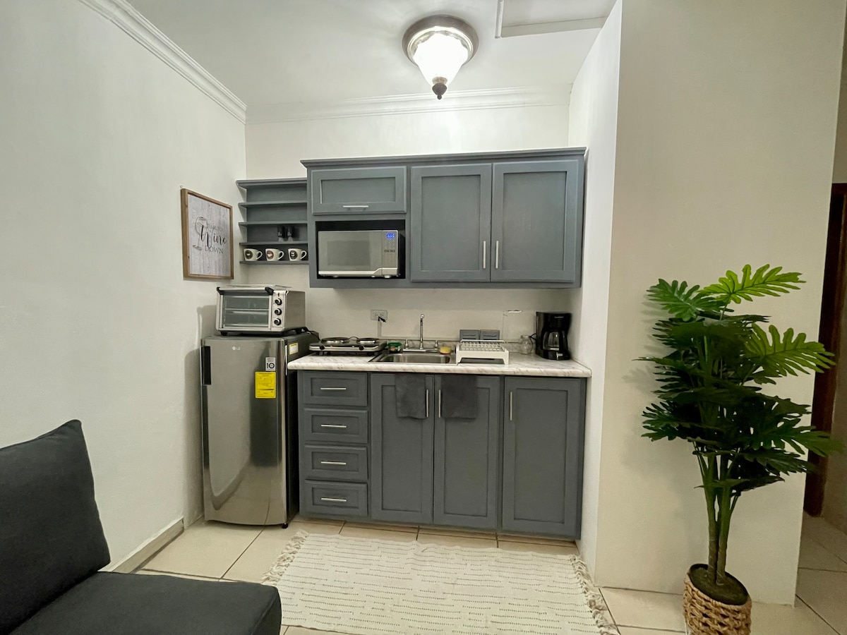 El estudio está muy bien equipado con todo lo necesario ideal para 2 personas que buscan un lugar tranquilo en buena ubicación Cuenta con una pequeña cocina, cama Queen size, área de trabajo, TV, baño privado. El estudio está en la segunda planta. 🏊El uso de la piscina es hasta las 10pm 🚫 No es permitido las visitas. 👮Solicitamos imagen del ID de los huéspedes. 🚬 No es permitido fumar. ⚡NO cuenta con generador eléctrico. Tomar en cuenta todos los reglamento.