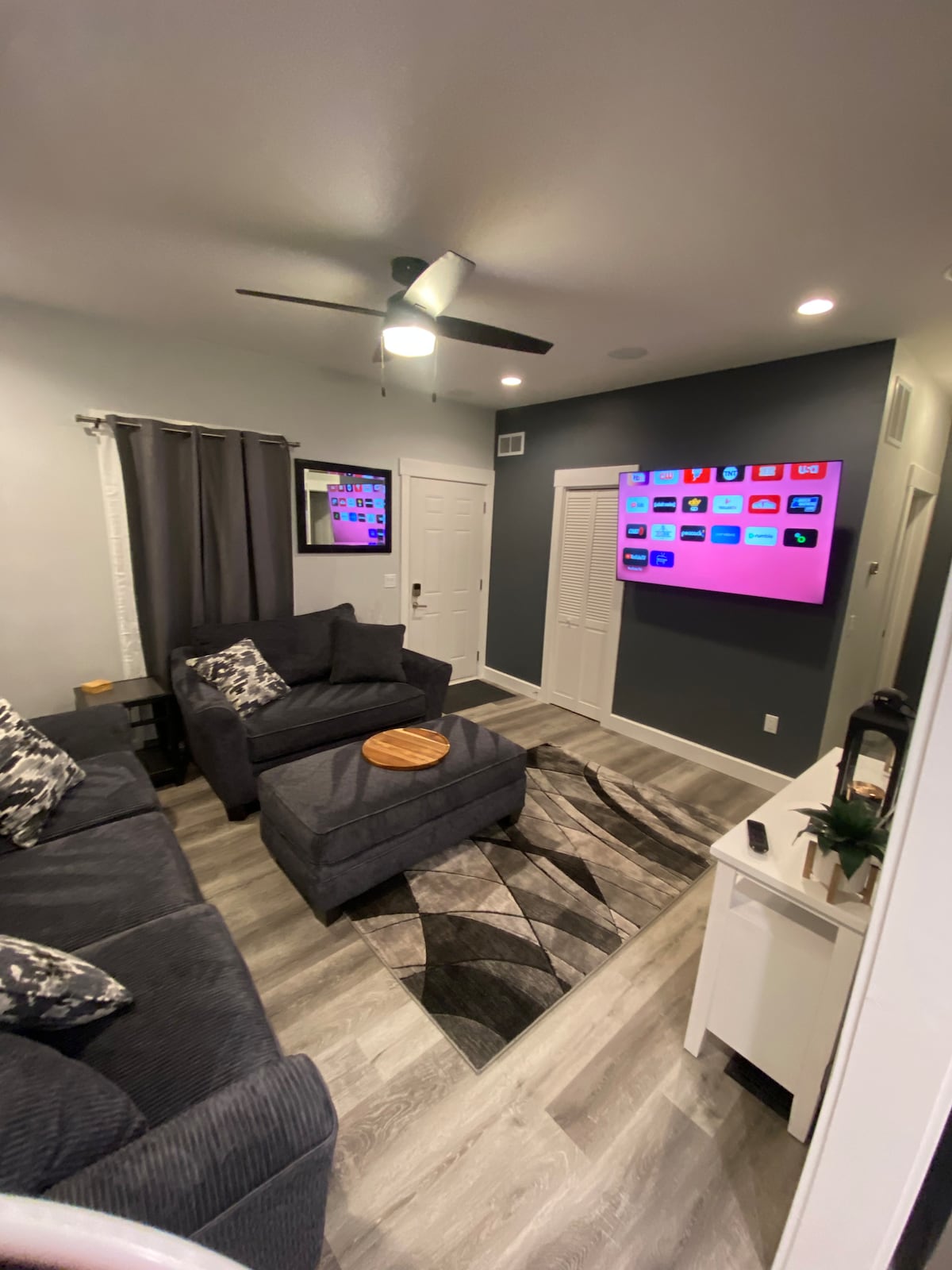 Maison spacieuse à deux niveaux avec un espace de vie ouvert parfait pour les petits rassemblements et les familles. À côté de la salle à manger, il y a une terrasse surdimensionnée avec un barbecue, une grande cour arrière clôturée et un foyer pour votre plaisir. Le sous-sol offre une grande télévision 60" avec Amazon Video. Il y a des épiceries, des restaurants et plus encore à proximité. Une buanderie est également disponible. * Veuillez vous renseigner si vous êtes intéressé par un séjour plus long, nous pouvons avoir des disponibilités qui n'apparaissent pas sur le calendrier.