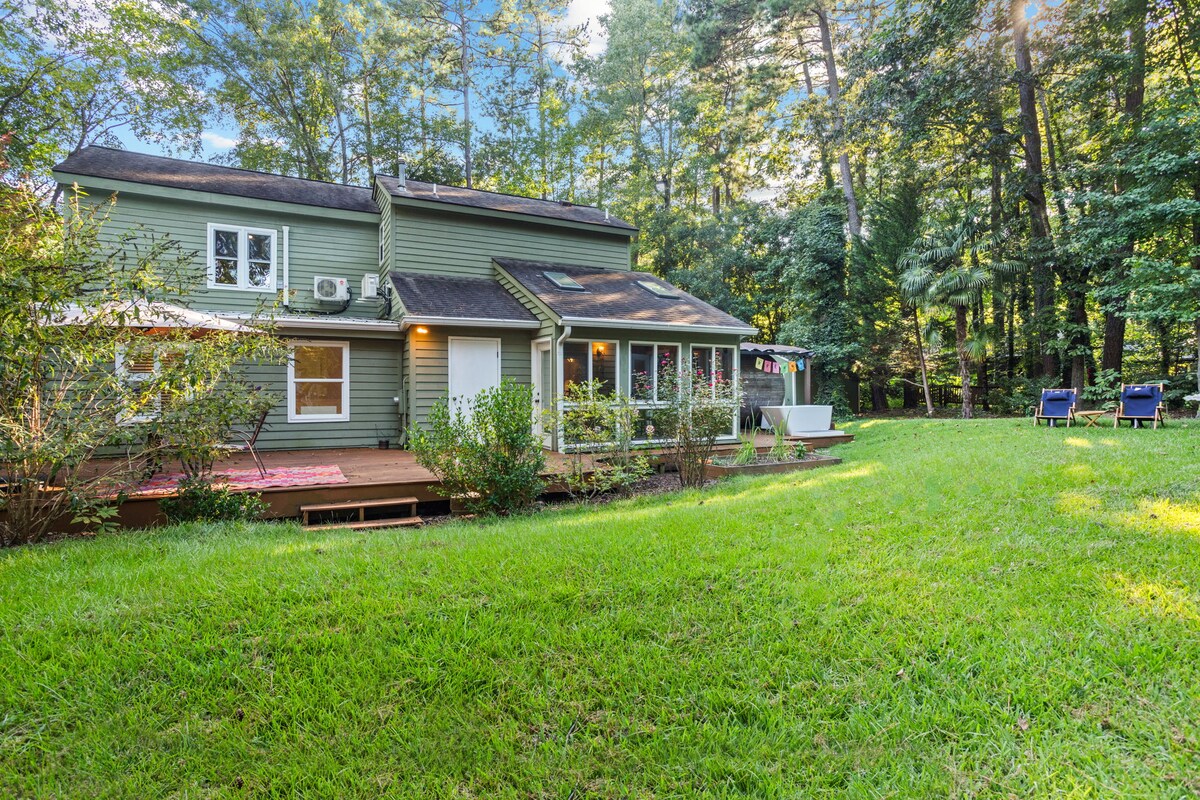 Évadez-vous dans la tranquillité de cette charmante oasis d'un demi-acre à côté d'un merveilleux parc d'État et à quelques minutes des hauts-lieux locaux. Sirotez du thé sur les porches surplombant des jardins luxuriants. Détendez-vous à l'ombre du chêne. Entrez par des planchers de bois d'origine, une cuisine moderne, des lits confortables et des touches artistiques. Que vous soyez seul ou en famille, cette retraite unique dans le village de Bynum vous enveloppe de calme. Promenez-vous au bord de la rivière ou dans la ville funky et laissez les courants apaiser votre âme.