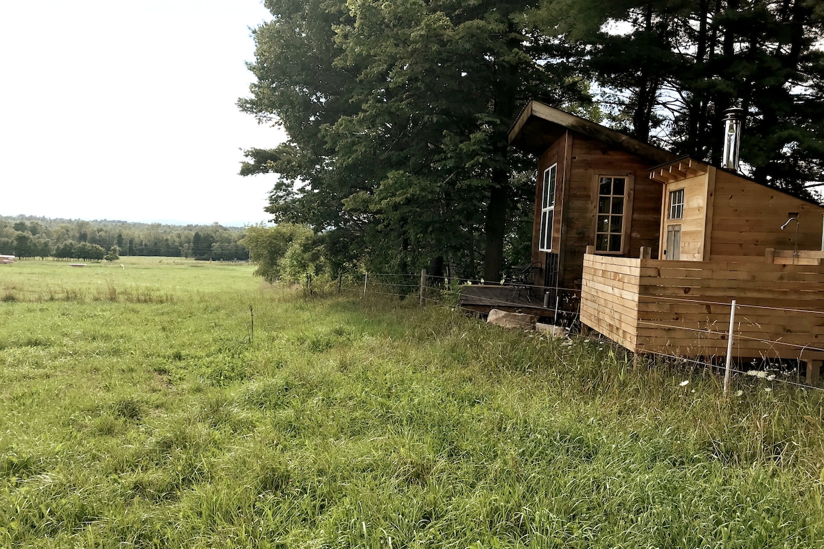 Cette petite cabane hors réseau est située dans un endroit paisible et magnifique dans une petite ferme d'élevage en activité dans l'est des Adirondacks. Votre vue donne à l'ouest sur la montagne Whiteface, etc. Profitez du bourdonnement de la nature depuis le porche qui surplombe nos pâturages, et laissez-vous tenter par le petit sauna traditionnel et la douche extérieure chaude/froide qui accompagnent votre cabane. La brasserie AuSable est juste en face et le lac Champlain est à seulement 1 mile. Excellents endroits pour faire du vélo, du canoë, de la randonnée et du bateau.