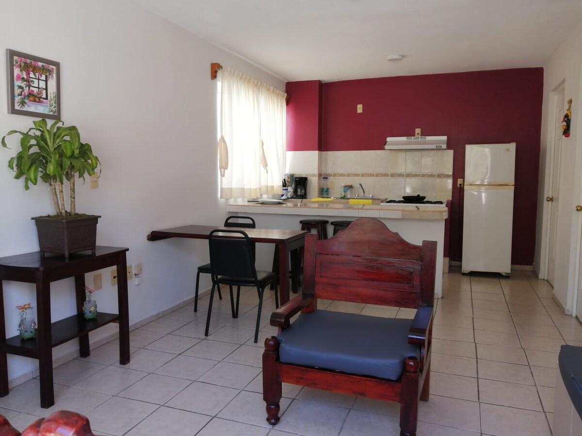 Bel appartement spacieux et lumineux à seulement 5 minutes à pied de la gare routière ADO, Chedraui, Telcel, la cañada et d'autres zones commerciales et à 12 minutes du parc central. Les arrêts de transport vers les ruines se trouvent à côté de l'Ado. En face de l'appartement, vous trouverez une épicerie, la Colonia est calme et sûre, de sorte que vous pouvez garer votre véhicule dans la rue sans souci. Très propre, désinfecté, gel antibactérien inclus. Nous facturons !!