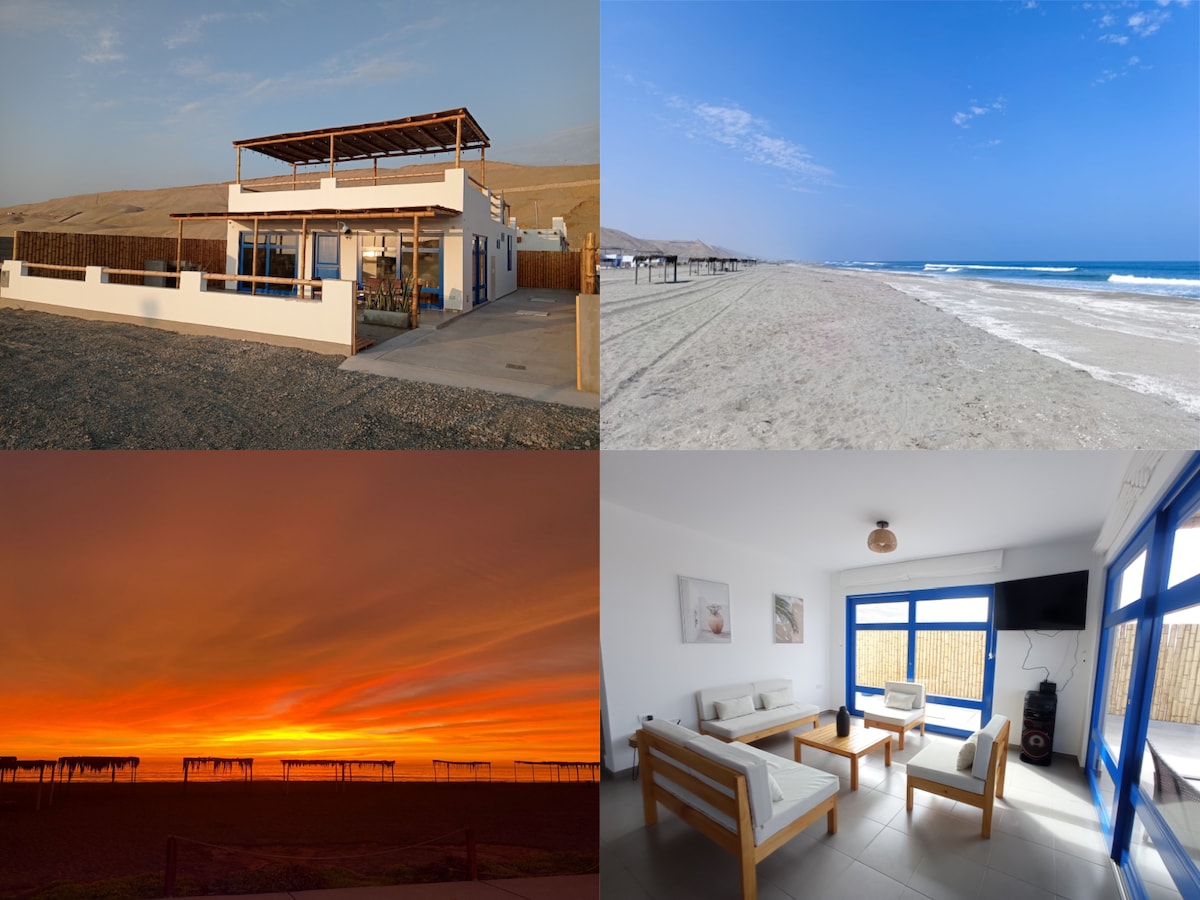 Bonita casa de playa en primera línea. Vista hermosa a toda la inmensidad del mar, desde la terraza, desde la cama y balcón principal, desde la cocina, desde la sala principal y sala de estar, desde la puerta cerca al bar. Relájate en un lugar tranquilo con brisa marina, cielo azul y sonido de las olas. Descansa en la hamaca, en las tumbonas Refréscate en la piscina! Internet Satelital Starlink, ideal para trabajo remoto, realiza videollamadas en HD (Zoom, Teams, Meet), toda la familia conectada