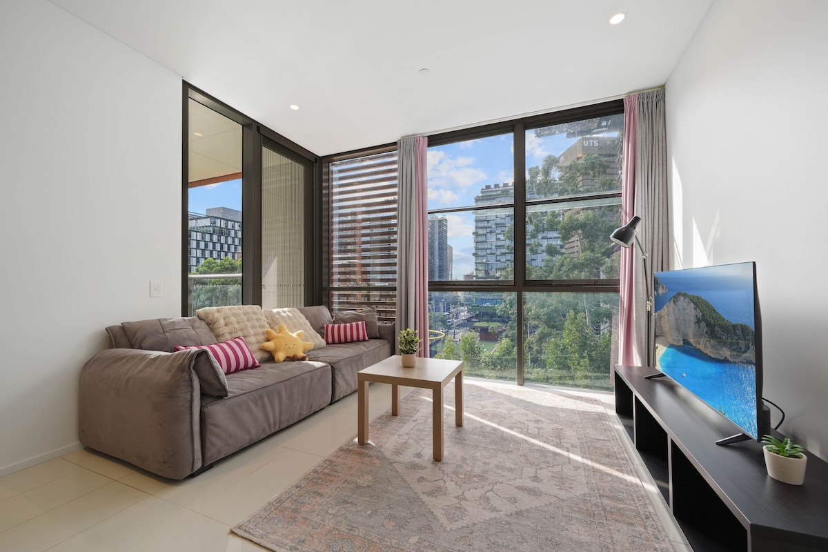 Welcome to your light-filled inner-city escape in the heart of Chippendale. This charming one-bedroom apartment offers a warm and practical home base with a clever open-plan layout, stylish furnishings and everything you need for a relaxed and comfortable stay. The living area is bright and inviting, featuring a queen-size sofa bed and a private balcony framed by leafy views — the perfect spot for a morning coffee or an evening drink.