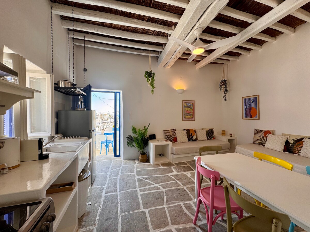 Découvrez un exemple unique d'architecture cycladique pleine de caractère située au milieu de la partie la plus animée de l'île d'Ios. Notre maison cycladique historique centenaire récemment rénovée est située au cœur de Chora, le centre de l'île. Avec une magnifique combinaison d'éléments classiques et traditionnels tels que de hauts plafonds entièrement en bois et d'épais murs de pierre, avec des éléments plus récents et plus frais, la maison offre aux voyageurs tout le confort de tous les jours.