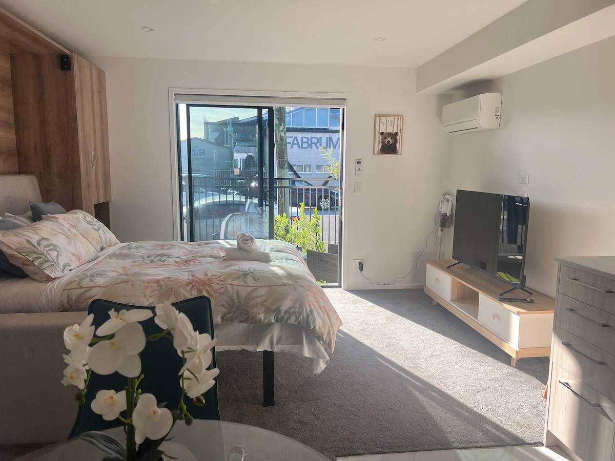 Vue sur le jardin, cuisine équipée, réfrigérateur, micro-ondes, four de table, pichet, grille-pain, lit queen size, canapé (devient un canapé-lit principalement utilisé par les enfants ou les adultes de petite taille).Il y a un supplément de 20 $ pour la 3e personne. Proche de Hagley Park et Merivale Mall, Restaurants, ligne de bus vers CBD. Il y a un parking hors rue. Utilisation d'une petite cour arrière avec une table et des chaises. Deux VTT sont disponibles en prêt avec un préavis.