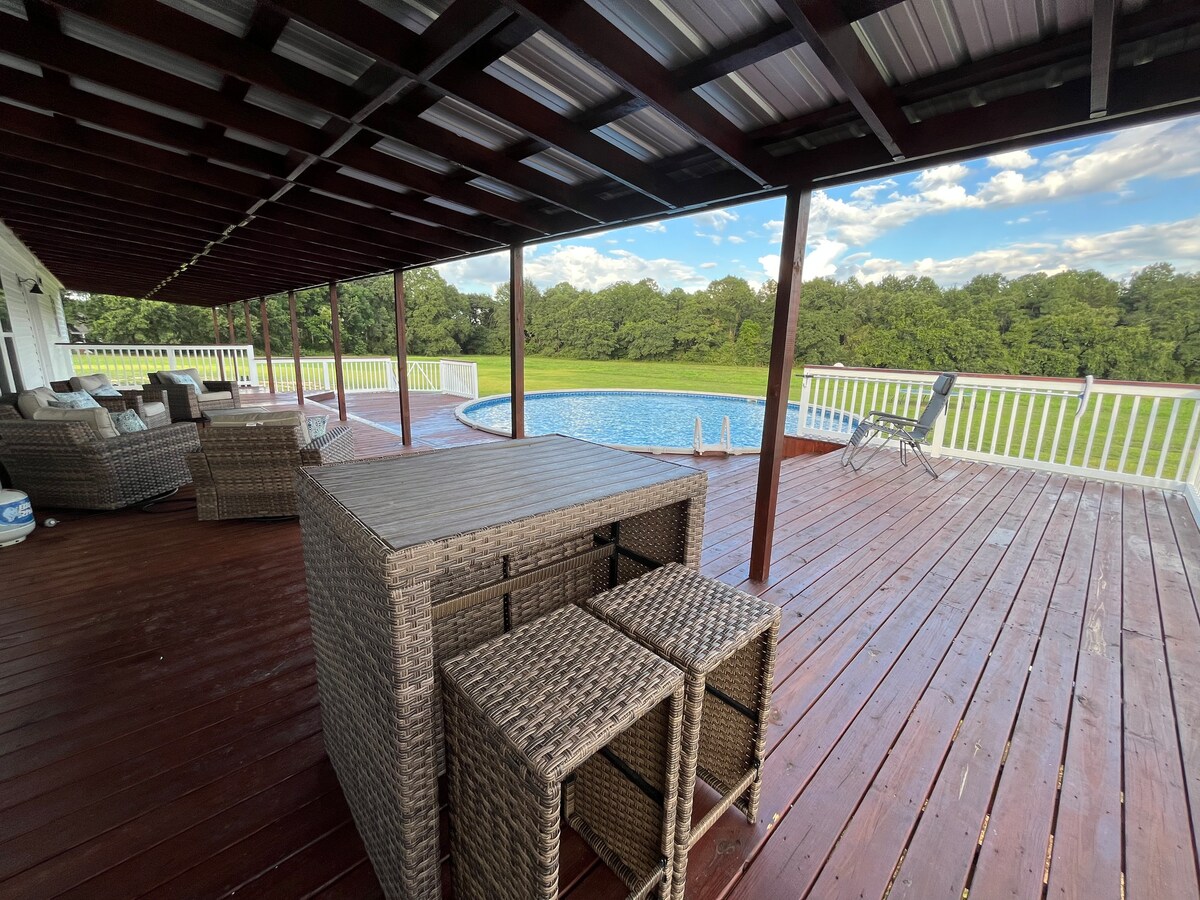 Profitez de cette maison de style ferme de 3 chambres avec piscine, jacuzzi et terrasse. Cette maison est située sur un magnifique terrain à la campagne avec intimité. Cette maison dispose de 3 chambres dont 1 lit King Size, 1 lit Queen Size, 2 lits jumeaux, 2 salles de bains, piscine de 33 pieds, jacuzzi, terrasse meublée, barbecue au charbon de bois, foyer, Wi-Fi, plusieurs téléviseurs, petit bureau, laveuse et sécheuse. Faites un voyage rapide en ville pour faire l'épicerie ou dîner... Publix/Walmart/Longhorns à 4-5 miles Des tonnes de magasins et de restaurants à moins de 10 miles.