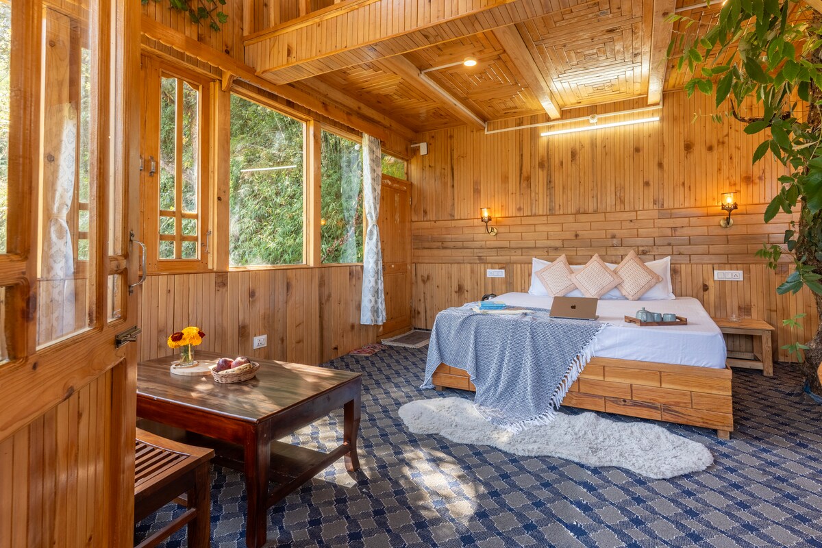 Glamoreo, à seulement 1 heure de Shimla. Superbe intérieur en bois de noyer, y compris tous les meubles. Baignoire extérieure en bois, parfaite pour se baigner dans l'air frais de la montagne. Les environs sont ouverts et spacieux. Vous pouvez vous promener, profiter des vues panoramiques et découvrir la vie rurale. Tout ici est biologique, de la nourriture aux produits laitiers. Si vous n'avez pas envie de repas faits maison, il y a des cafés et des restaurants à seulement 3–4 km, et vous pouvez leur rendre visite ou faire livrer de la nourriture