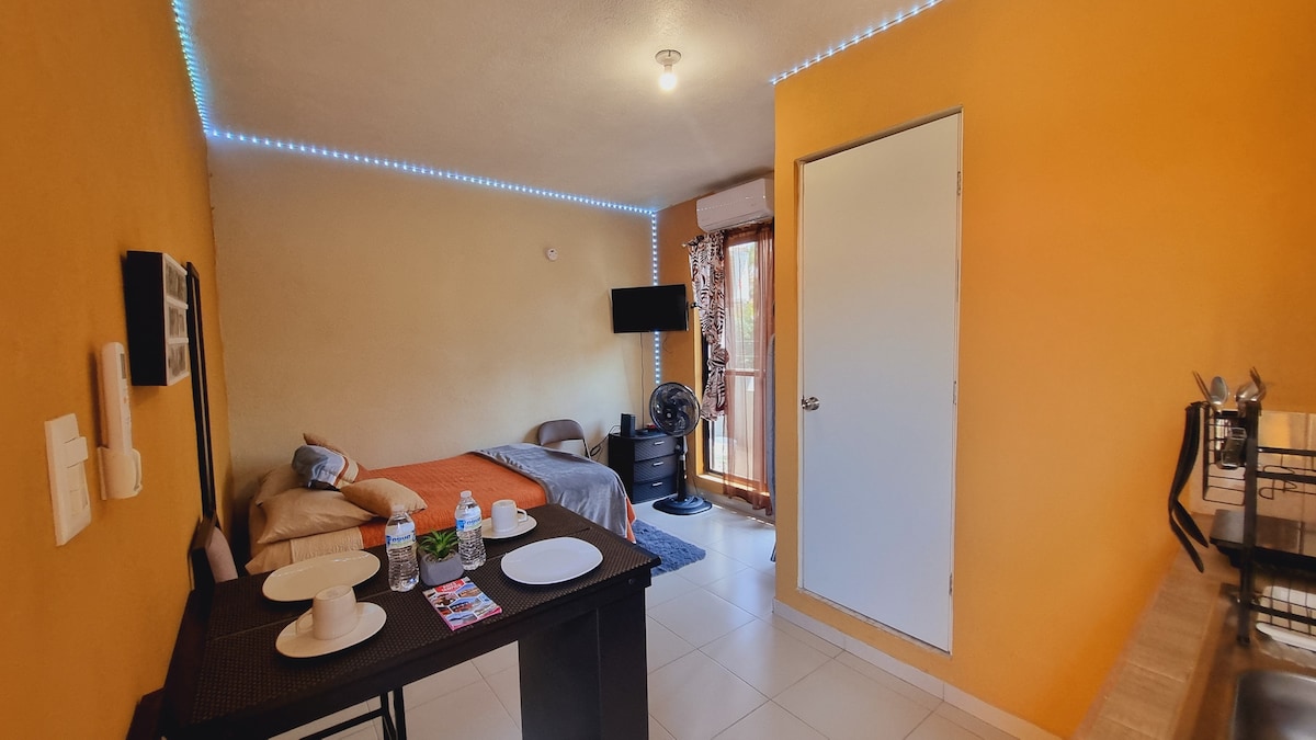 Mini departamento confortable y moderno en planta baja, ubicado en colonia residencial a espaldas de la UAT, a 20 minutos de la playa y centro de espectáculos en la laguna del carpintero. Cuenta con cama matrimonial, área de trabajo con wifi, baño privado, aire acondicionado, cocina con frigobar y horno de microondas. Entrada independiente autónoma. Se emiten facturas