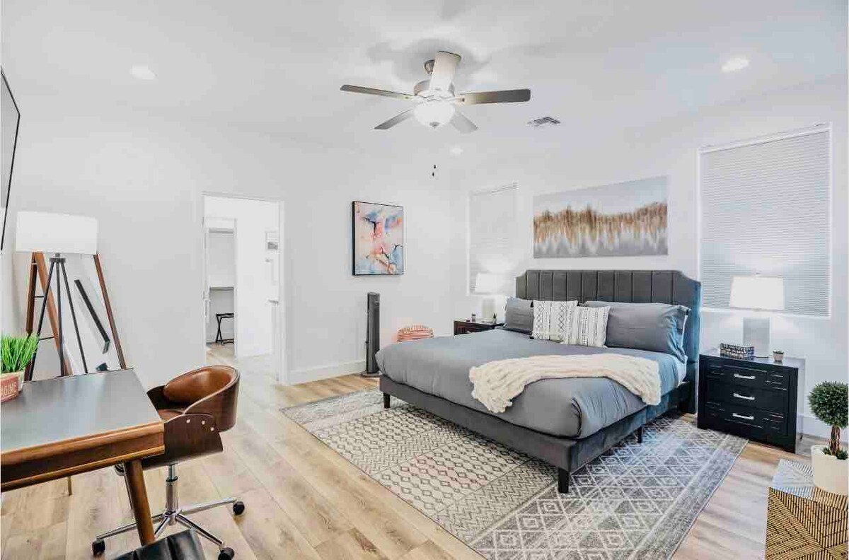 This newly renovated (2025) modern desert studio offers the perfect blend of privacy and comfort. While attached to the main house via double exterior soundproof doors, it has its own separate entrance, ensuring complete privacy and a peaceful retreat. Inside, you’ll find a luxurious CA king-size bed, creating the ideal space for rest and relaxation. Large windows frame breathtaking views of the surrounding desert, filling the studio with natural light and offering a serene, calming atmosphere.