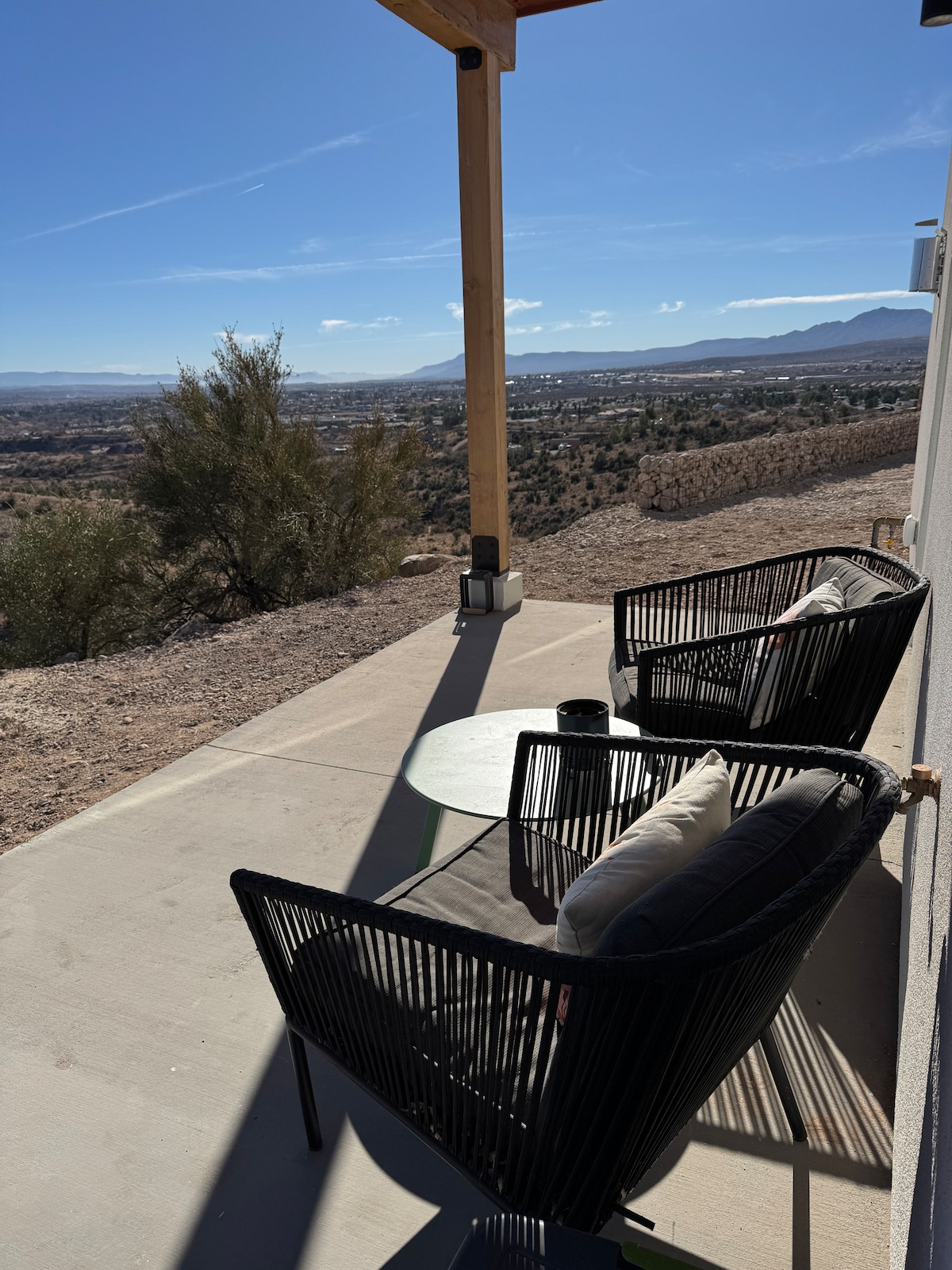Ce studio moderne dans le désert récemment rénové (2025) offre le mélange parfait d'intimité et de confort. Lorsqu'elle est attachée à la maison principale par des doubles portes extérieures insonorisées, elle dispose de sa propre entrée séparée, assurant une intimité totale et une retraite paisible. À l'intérieur, vous trouverez un lit king size luxueux, créant l'espace idéal pour se reposer et se détendre. De grandes fenêtres offrent une vue imprenable sur le désert environnant, remplissant le studio de lumière naturelle et offrant une atmosphère sereine et apaisante.