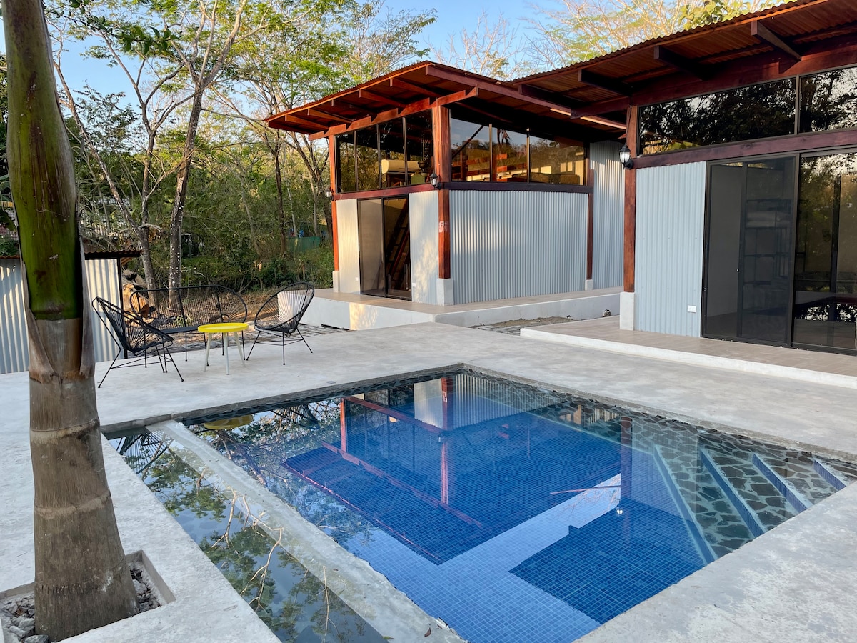 Cabine lumineuse et aérée de 2 lits à seulement 2 pâtés de maisons de l'océan - disponible pour les locations mensuelles de mai à décembre. Comprend un lit queen size surélevé, un grand lit inférieur, une grande salle de bain, une cuisine, une climatisation, une connexion Wi-Fi Starlink et une terrasse extérieure ensoleillée avec barbecue. Piscine partagée, propriété privée calme et configuration idéale pour le travail à distance ou la vie saisonnière. Réservez dès maintenant des séjours plus courts en haute saison ! Profitez de la scène rurale océan/jungle du Costa Rica près de Santa Teresa et Montezuma, mais loin de toute la folie.
