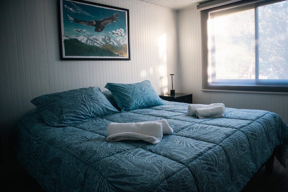 Relájate con la familia en este tranquilo lugar junto a Reserva Nacional Tamango. Ideal para desconectarse de la rutina y conectar con lo simple y apacible de la patagonia. Cabaña matrimonial con cama King. Futon disponible para una persona más.