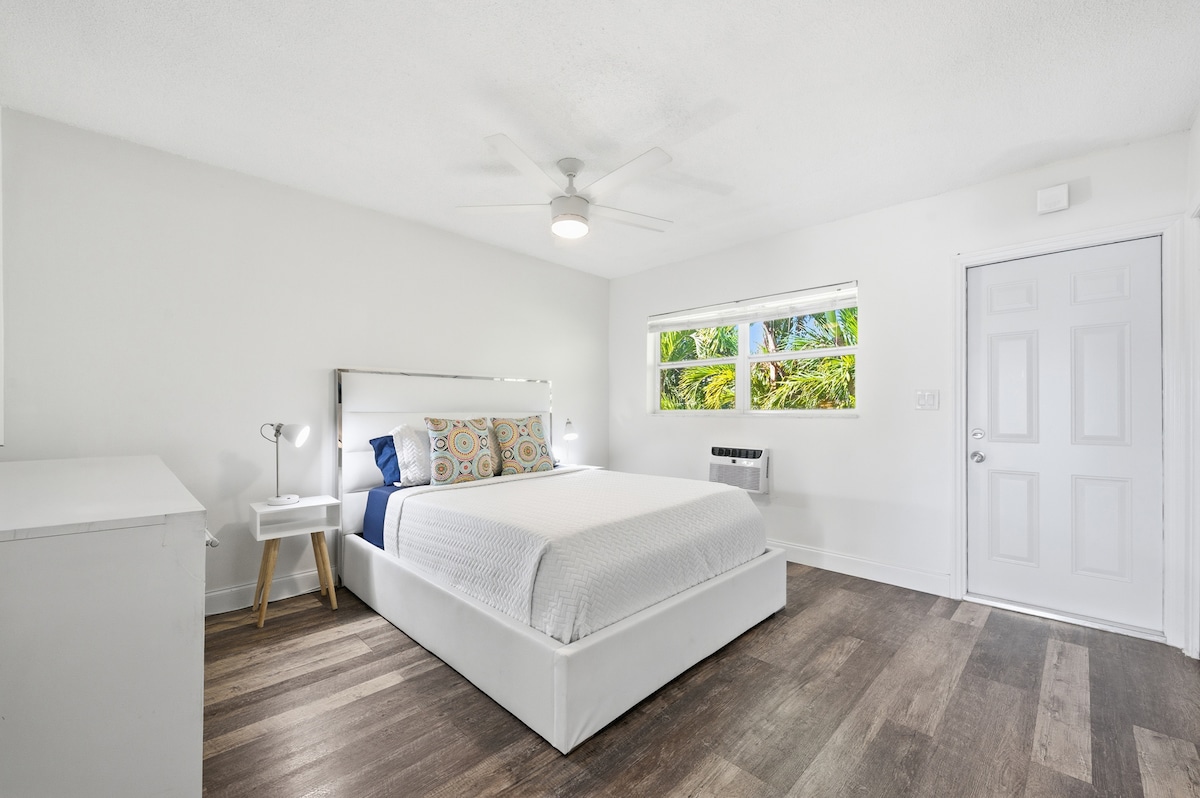 Airbnb's #1 Wishlisted property in Broward! Our cozy Studio apartment offers fullsize stocked kitchen & bath & lots of extras! Private entrances front & back. Tropical Pool area (shared) w/resort feel just out the backdoor. Close to beaches, airport, port etc. Fits 2 with comfy queen bed. Walk to great restaurants & BBQ available for $5. Experienced onsite SuperHosts with over 12+ yrs of experience & 2800+ reviews.Come join us at our Airbnb compound! Studio is on the right of aerial photo.