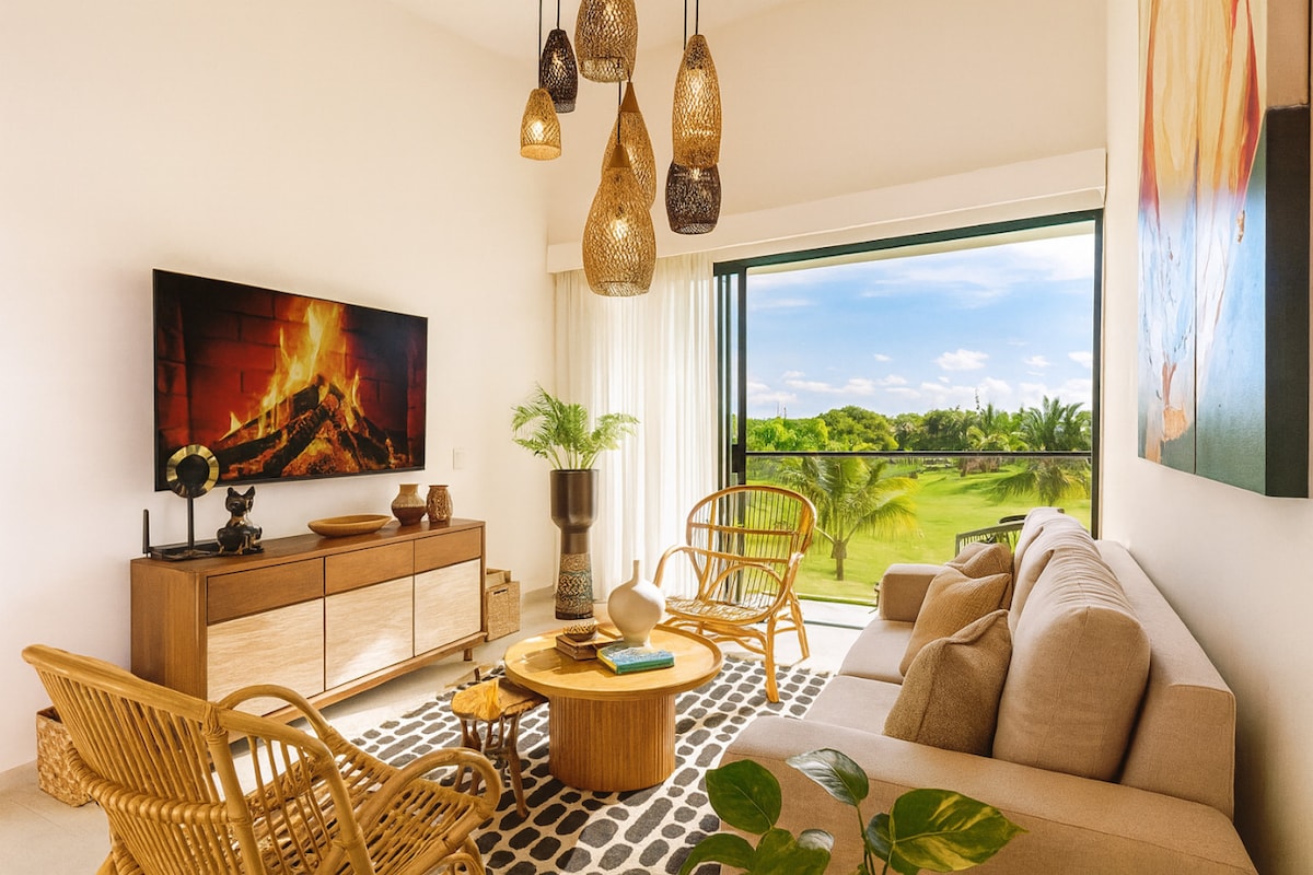 Retraite élégante de 2 chambres à Cocotal Bienvenue dans votre escapade tropicale à Bavaro, Punta Cana ! Cet appartement spacieux offre une vue imprenable sur le terrain de golf depuis les deux chambres et offre un accès direct à la piscine depuis la terrasse. Profitez de l'atmosphère paisible et profitez du terrain de golf à proximité pour une partie de golf. À seulement 7 minutes de la plage et à 15 minutes de l'aéroport, cette retraite magnifiquement conçue est parfaite pour la détente ou l'aventure. Nous avons hâte de vous accueillir !