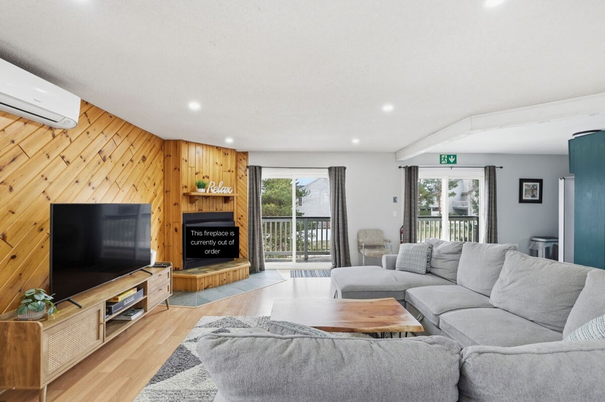 SKIS AUX PIEDS depuis la terrasse arrière (en fonction de la neige) !! Remarquez la quantité de sièges confortables pour NEUF PERSONNES autour de la télévision, ce qui n'est pas le cas dans beaucoup d'autres endroits. À la fin d'une longue journée de ski, avoir un endroit confortable où tout le monde peut s'asseoir est ce qui manque à la plupart des chalets. Profitez du magnifique chalet de notre famille au REZ-DE-CHAUSSÉE, rénové avec 2 chambres, 2 salles de bain et 6 lits, idéalement situé à côté du Blue Mountain Inn. Blue Mountain Village est à 7 minutes à pied. Emplacement, emplacement, emplacement