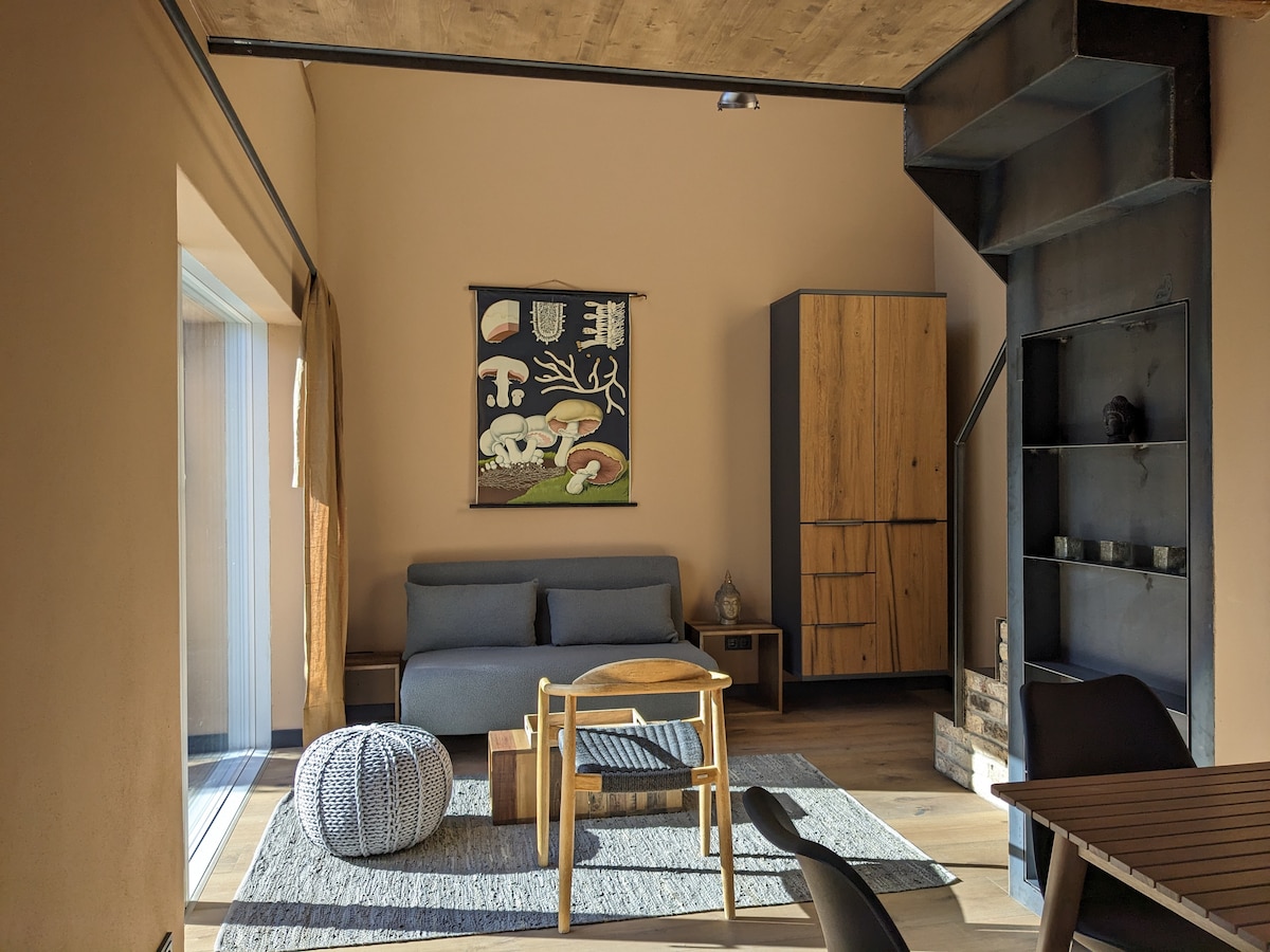 Appartement unique avec mur en pierre de carrière antique et charpente en bois ! À l'étage, il y a deux chambres et une salle de bains. Au rez-de-chaussée, il y a une grande cuisine-séjour avec cheminée. Un beau coin salon privé avec barbecue se trouve dans la cour intérieure fermée. Internet par fibre optique.