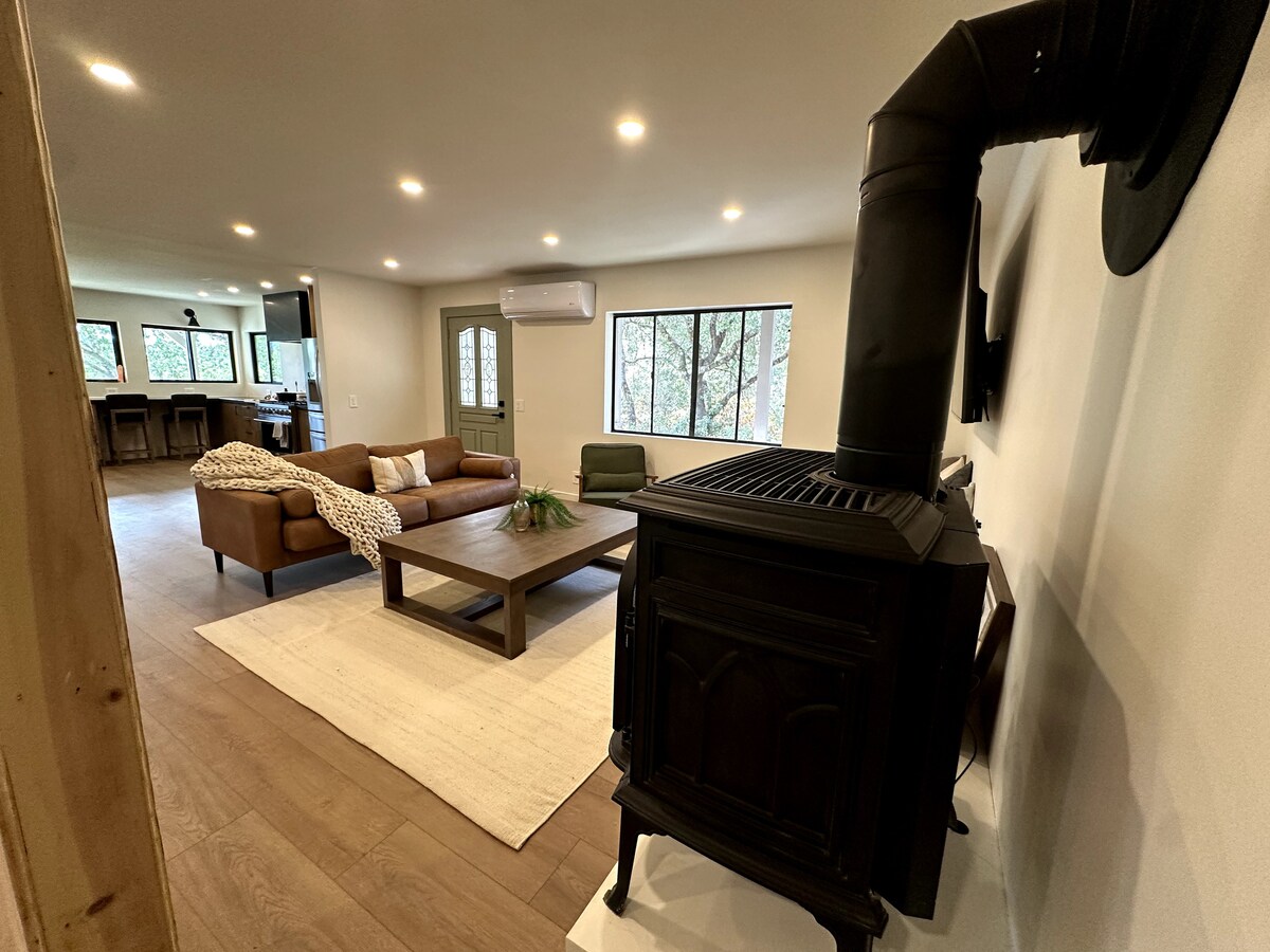 This cozy, mid-century style home is right on the river on a calm stretch just below Marshall Gold Discovery Park. Walk down the stairs from the deck and splash in the river! The large deck offers space to enjoy the outdoors. Comfy furnishings make up this 1050 sq.ft. home. We have a gas BBQ grill for you to get your grill on as you look out over the river. There is a dining table outside by the grill and one inside. VHR#073574