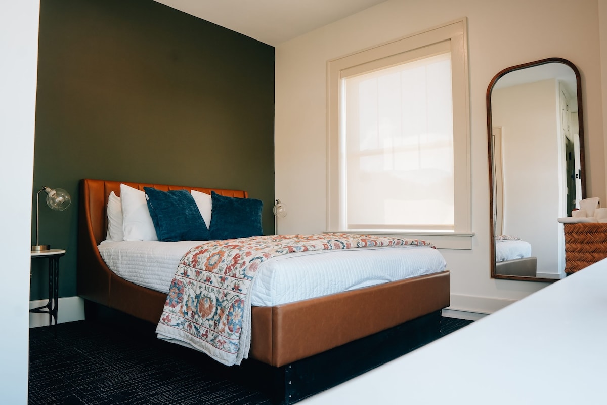 Experience the Inn’s history in the only room with its original 1930s layout. Featuring a queen bed, private bath, and balcony access, it’s perfect for relaxing with coffee overlooking Main Street — with our café just below.