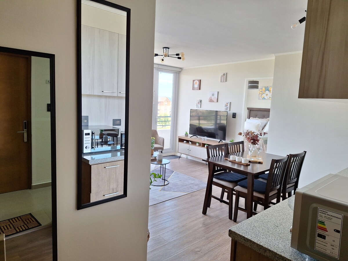 Vous séjournerez dans un nouvel appartement, confortable, entièrement équipé, avec parking et spécialement conçu pour les courts ou longs séjours. Il dispose de 2 chambres, chacune avec salle de bain privée, télévision connectée avec télévision par câble et Wi-Fi. Bureau, lave-linge, salon, cuisine équipée, terrasse et parking privé. Connecté aux principales avenues, à 7 pâtés de maisons du centre de Concepción, à proximité des supermarchés, des transports en commun, des parcs et des pistes cyclables. Déplacez-vous facilement en voiture, en transports en commun ou à vélo.