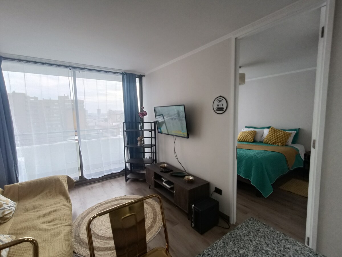 Appartement neuf, central, confortable, propre, sûr, moderne, meublé, deux pièces, équipé pour 3 personnes, se compose d'une chambre avec un lit double de 2 places et un canapé-lit. Il dispose également de la télévision par câble, wifi, terrasse, chauffage, gril électrique, salle de sport, conciergerie, 24 h/24, parking, buanderie (lave-linge et sèche-linge) locomotion à la porte, à proximité des supermarchés et des universités, centre de Concepción, situé en face du stade Collao, à quelques pas du terminal Collao