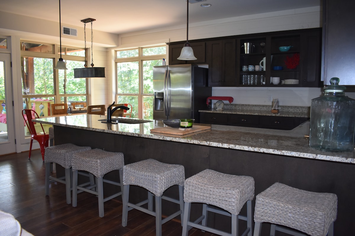 Débranchez et laissez la nature vous mettre au repos. En vous réveillant du côté ouest du lac, vous pourrez faire l'expérience de la magie de la lumière du soleil rebondit sur l'eau et le porche. La faune abonde et les lève-tôt peuvent voir des hérons bleus pêcher pour le petit-déjeuner sur la pointe de la propriété. Les observations de pygargues à tête blanche sont fréquentes car un nid est situé de l'autre côté du lac à l'extrémité nord de l'île. Terminez la journée en sirotant votre boisson préférée près du foyer.