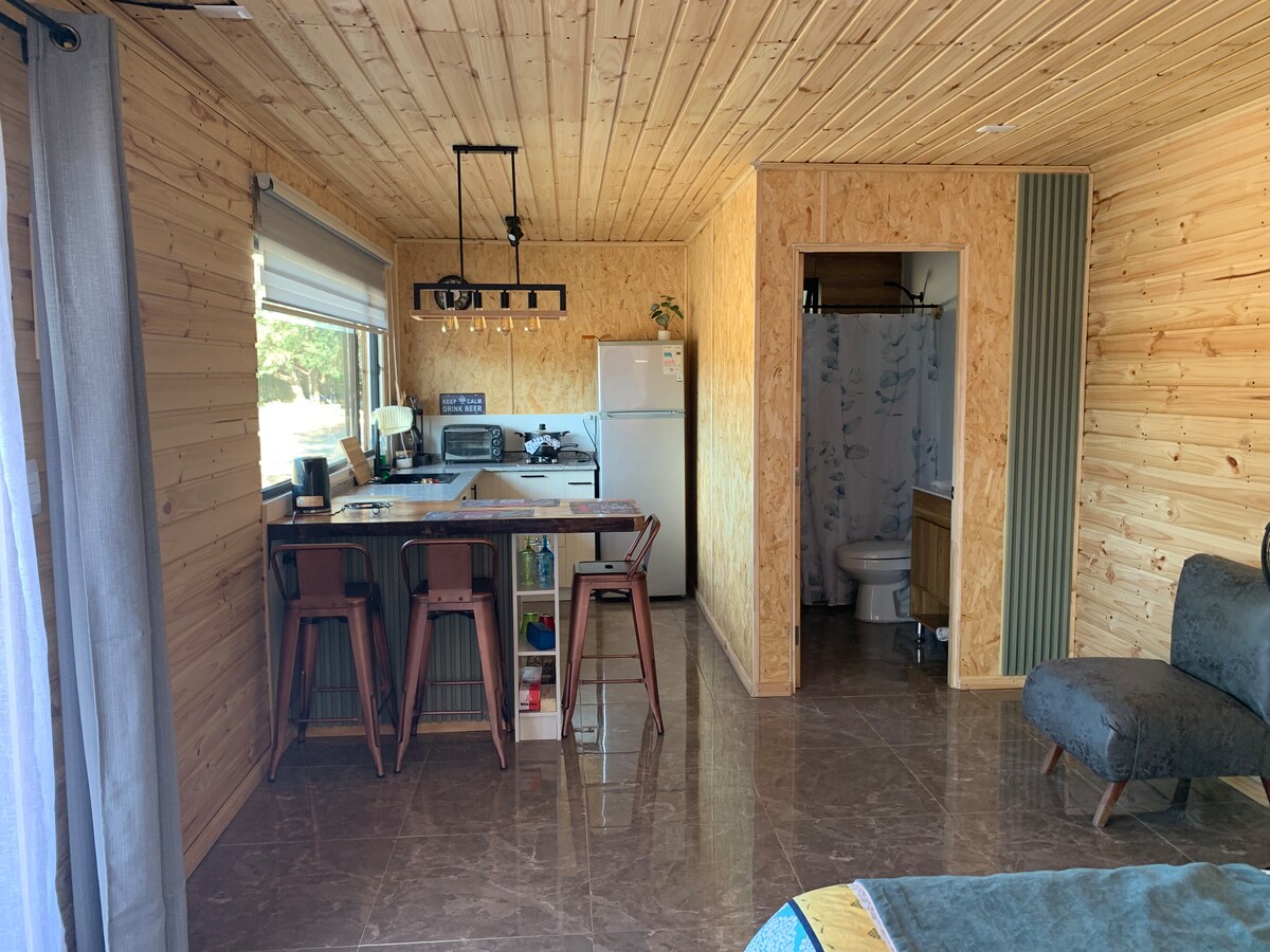 Découvrez le littoral de Maule comme jamais. Vue sur l'océan avec une façade entièrement vitrée de 14 mètres de long avec des baies vitrées qui font de la vue un spectacle ouvert 24h/24. Au cas où vous auriez besoin d'un peu plus de sommeil, descendez simplement les rideaux occultants et vous êtes bien. Le loft dispose de 1 lit double, d'un canapé-lit, d'une terrasse protégée par le sud, d'une connexion Internet Starlink, d'une cuisine entièrement équipée et d'une élégante salle de bain en pierre et en bois. 10 km au sud de Curanipe, 300 mètres de la route principale et à quelques pas de la plage.