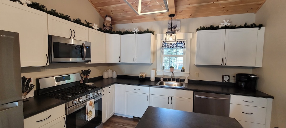 À seulement 15-20 minutes en voiture de Sugarloaf et à 3 minutes du centre-ville historique de Kingfield, ce chalet offre un répit paisible et privé après une journée bien remplie sur la montagne. Notre chalet écologique de 2 chambres et 1 salle de bain est en retrait de la route, avec des voisins éloignés et une connexion Wi-Fi rapide. Vous pouvez être entouré par la nature, mais à seulement quelques minutes de charmants restaurants, de boutiques locales, d'une épicerie, d'une station-service et de nombreux sentiers, rivières et lacs pour la raquette, le ski de fond, la motoneige, la randonnée, les cabanes, le VTT, le kayak et plus encore.