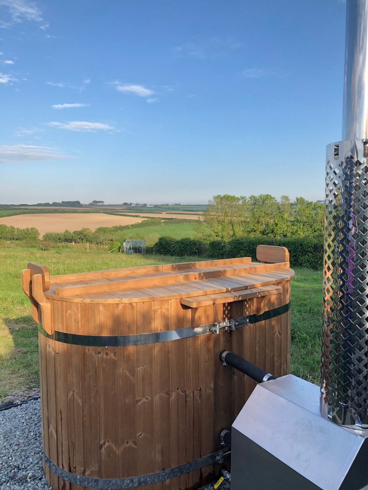 Conçu et construit par des artisans locaux, sans voisins proches. Jacuzzi privé au feu de bois non raccordé à l'électricité adjacent à la cabane (bûches fournies). Bénéficie d'une vue imprenable sur les terres agricoles ouvertes, une retraite idéale pour se détendre et se ressourcer. Près de la plage de Polzeath qui est à 25 minutes à pied à travers le terrain de golf. Intérieur de luxe, mini-cuisine (pas de four), salle de bain attenante (oui, à l'intérieur de la cabane !), poêle à bois et lit double confortable. Espace extérieur privé, avec un barbecue (charbon de bois NON fourni) et un hangar de stockage.