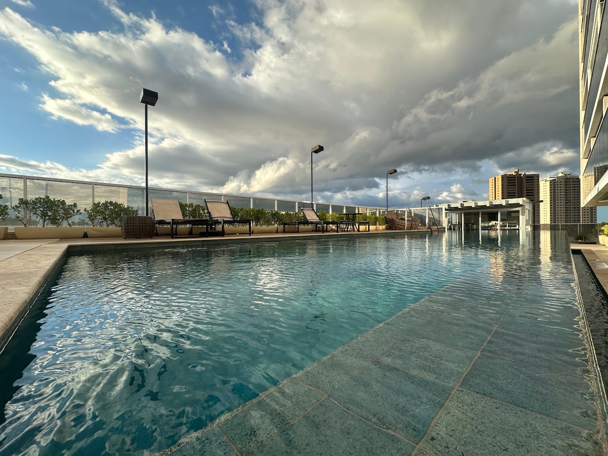 Détendez-vous dans cet hébergement compact et paisible, avec une vue spectaculaire et thérapeutique après une journée de travail fatigante. À proximité du New York Tower Business Center. À proximité des bars, restaurants, station-service, cafés, Mac Donalds, Habibs, Araçatuba Shopping et tout ce dont vous avez besoin. Espace de loisirs complet, lieu et ambiance familiale, moderne et agréable. Cuisinière à induction, douche moderne chaude, lit confortable, télévision avec toutes les applications que vous aimez, piscine et salle de sport.