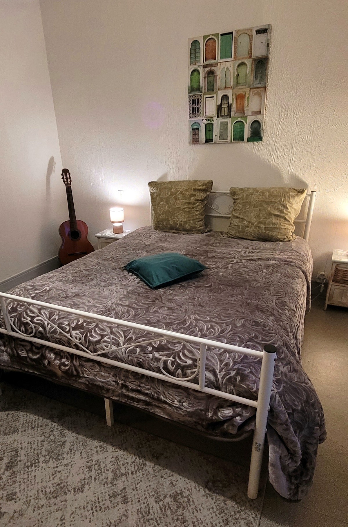 La chambre peut accueillir jusqu'à 4 personnes. Elle dispose d'un lit (160x200) et d'un canapé BZ (140x200), Bouilloire et mugs. Un lit supplémentaire pour un bébé peut être ajouté. La chambre dispose d'un téléviseur et d'une salle de bain privative et équipée d'une douche spacieuse et d'une vasque. Vous aurez un accès direct au jardin clos, pour profiter de l'extérieur. Un parking privé est à votre disposition.
