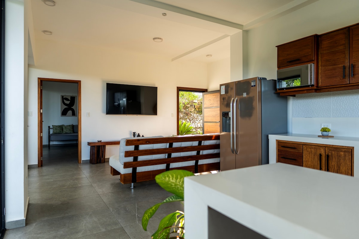 Belle suite rustique, style cabane avec de grandes fenêtres, fraîcheur et bois de la région. Il dispose d'un lit double et d'un canapé-lit 1 place et demie, avec entrée indépendante, et beaucoup de tranquillité, se compose d'un salon, d'une salle à manger et d'une cuisine complète avec tous les accessoires, en plus nous vous laissons du café et du thé pour que vous vous prépariez. Nous vous laissons des serviettes, des collations et de l'eau dans votre hébergement. Il dispose d'une télévision à écran plasma de 55pouces avec Amazon Prime, Netflix et HBO, ainsi que d'un Internet de 100 Mgbs ultra haute vitesse.