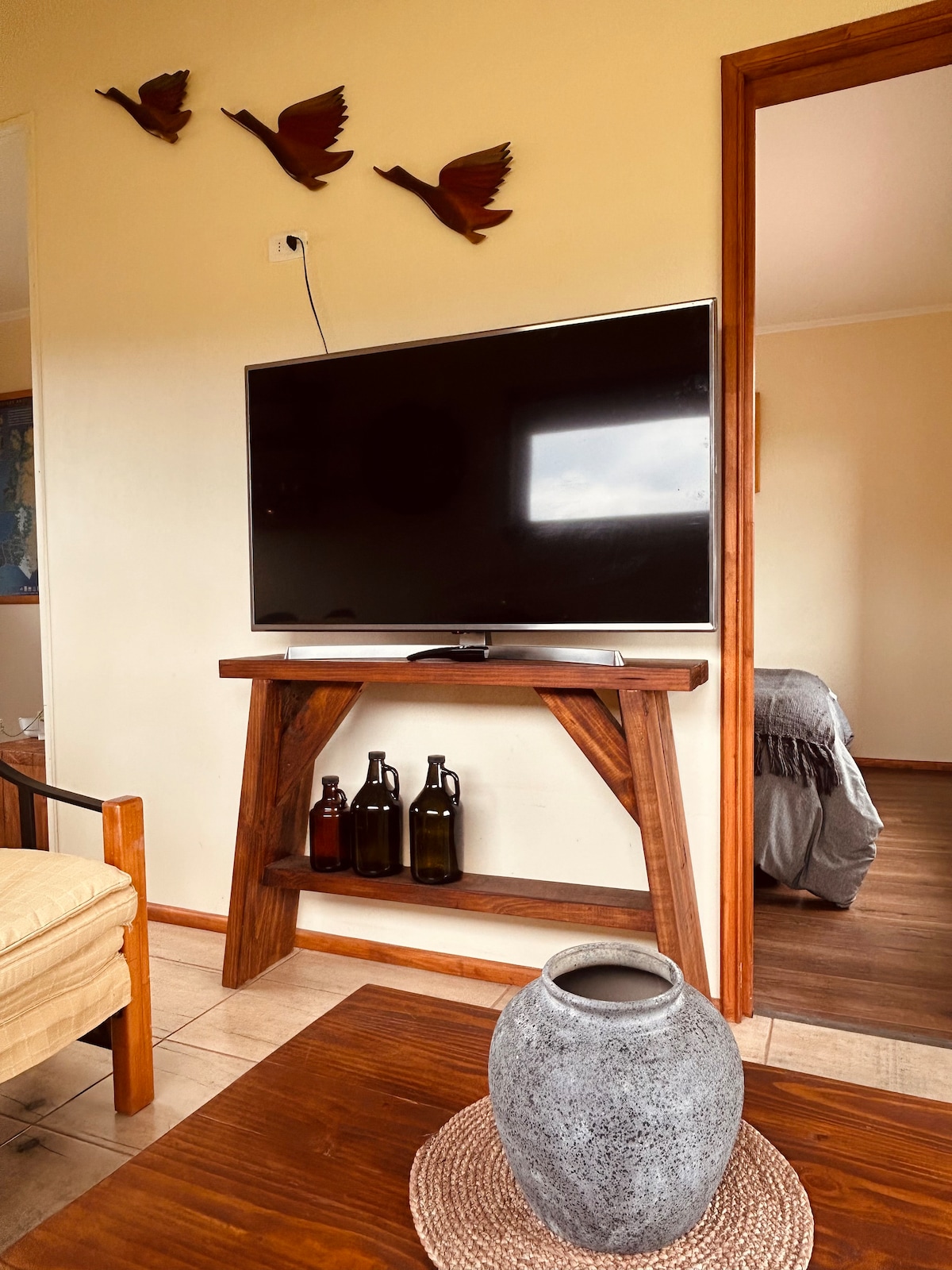 Belle cabane -Martin Pescador- en bois de 55 m² avec 2 chambres, une avec un lit double de 2 places et une autre avec un lit d'une place et demie plus un lit gigogne d'une place. Chauffage avec radiateur électrique et chauffage supplémentaire à granulés central. Grande salle de bain avec lave-linge inclus. Cuisine équipée et réfrigérateur. Excellente construction avec isolation thermique, plancher en bois et toutes les fenêtres en panneau thermique. Possibilité d'un excellent petit déjeuner pour 7 500 pesos chiliens p/p.
