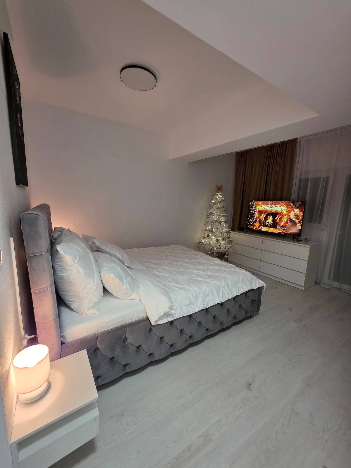 Appartement moderne et confortable situé dans le quartier central de Craiova dans une rue calme,équipé de nouvelles qui consistent en : une chambre spacieuse équipée d'un lit double, d'une télévision, d'un bureau, d'une commode ; d'un salon avec une grande télévision, d'un coin extensible ; d'un balcon magnifiquement aménagé, d'une nouvelle salle de bain équipée d'une baignoire ; d'une cuisine entièrement équipée : cuisinière,réfrigérateur, machine à laver, cafetière, hotte, assiettes, tasses, couverts, ustensiles de cuisine, etc. ;un couloir avec un cintre et un dressing. Tous les meubles et équipements sont neufs.