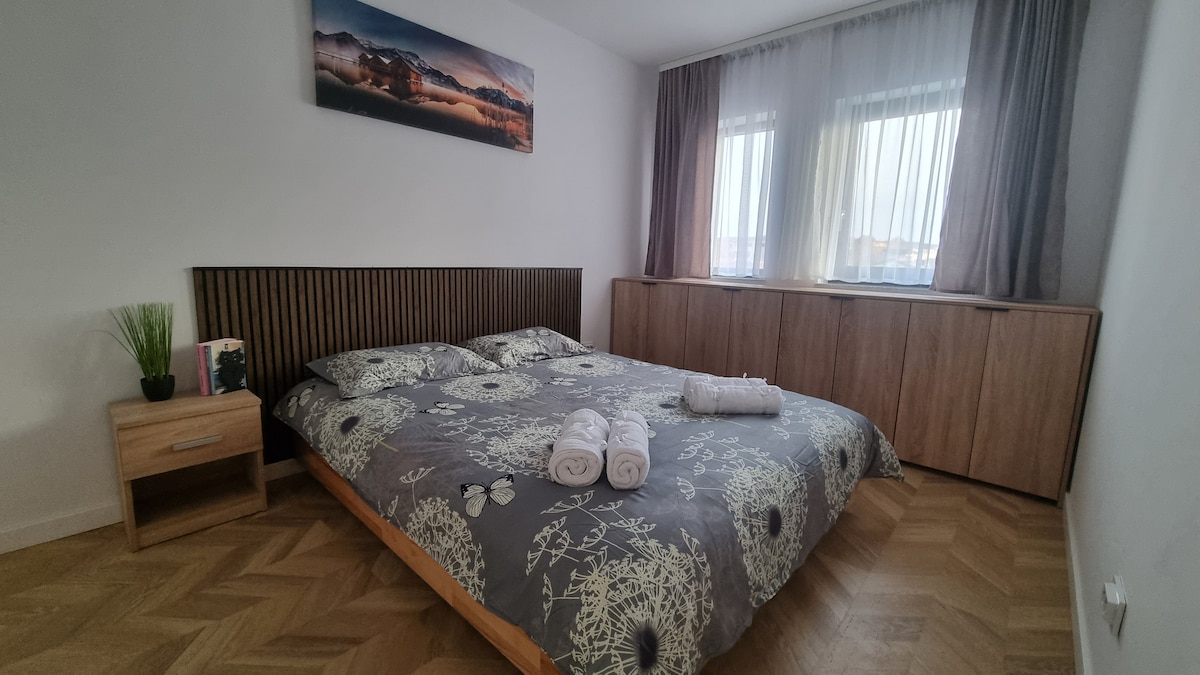 Amusez-vous en famille dans ce logement élégant. Appartement neuf 2 chambres avec 2 lits matrimoniaux + salon avec canapé-lit , cuisine ouverte et salle de bain ( complète ) meublée et équipée tout nouveau de qualité supérieure ! La propreté est tout d'abord irréprochable ! Nouveau bloc 2022 , rue , place de parking . Proche du centre ( 1km ) bon et quartier calme ! Lidl et Profi à 100m . Le bloc et le parking sont surveillés par vidéo ! prime D'IMPÔT et FACTURE ! ! !