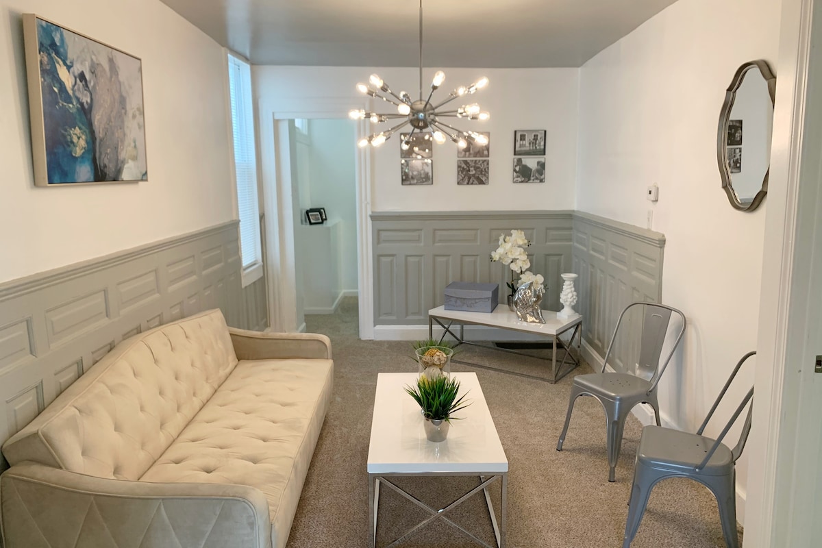 Vous adorerez cet appartement récemment rénové et situé au centre. Privé, 2e étage, 2 lits, cuisine complète, salle de bain, salle à manger, buanderie, appartement en duplex. Situé entre Boardman et Youngstown. À 5 minutes du centre de Covelli, du centre-ville et de YSU. Proche de Millcreek Park, de la restauration rapide, des restaurants gastronomiques, des commerces et des autoroutes. À 70 minutes des aéroports internationaux de Cleveland et de Pittsburgh. St Elizabeth Boardman 7mins, Mercy Health Youngstown 10mins, Akron Children hospital 3 min. Simplement pour les affaires ou le plaisir