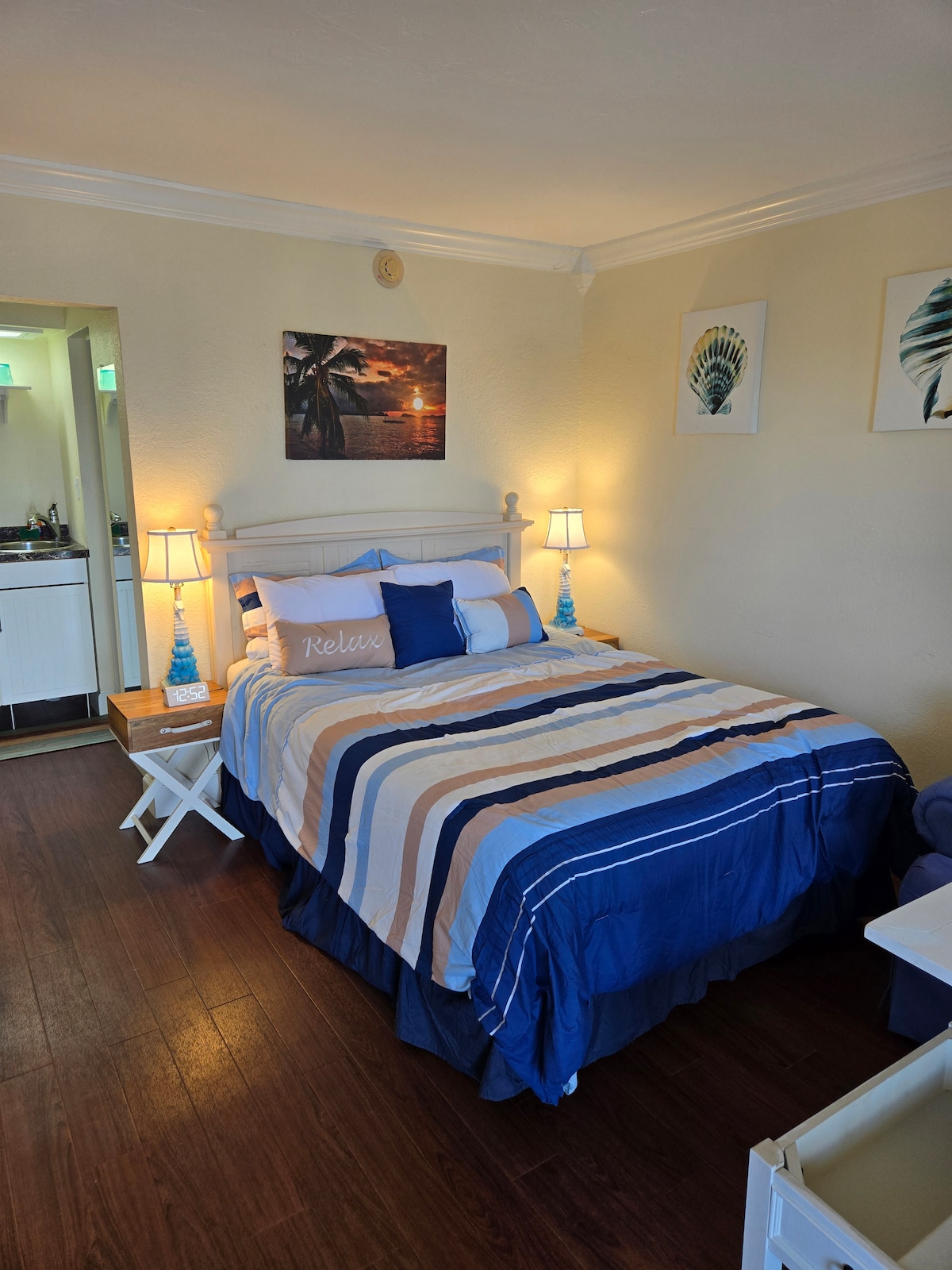 The ‘pool view’ overlooks the swimming pool & has a private covered open porch for shade 1 bed 1 bath w/ private entrance. The bedroom has a king sized mattress bed. The living room has a kitchenette area with a fridge, freezer, microwave, coffee maker and the essentials. There is a Smart TV. Separate bedroom with King size bed 3 mins walk to Crescent beach access #12 You can walk to a great choice of places to eat and drink Max 2 guests No smoking, No Pets, Great Location, Good Value.