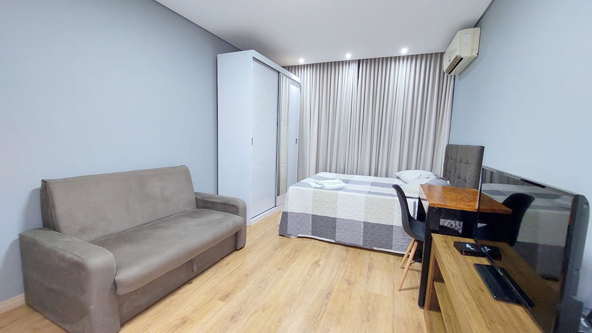Sécurité, confort et SUPER emplacement. Le logement peut accueillir jusqu'à 3 personnes et l'emplacement est parfait. Près d'Av Centenário, il est proche des marchés (BISTEK, ANGELONI et GIASSI) et des restaurants. Le site dispose d'une suite climatisée et d'un placard pour les séjours de courte durée. Le salon dispose d'un canapé-lit et d'une télévision CONNECTÉE, avec Wi-Fi inclus. La cuisine est complète (micro-ondes, cuisinière à induction, poêles, couverts) Idéal pour couple, petites familles ou voyages d'affaires.